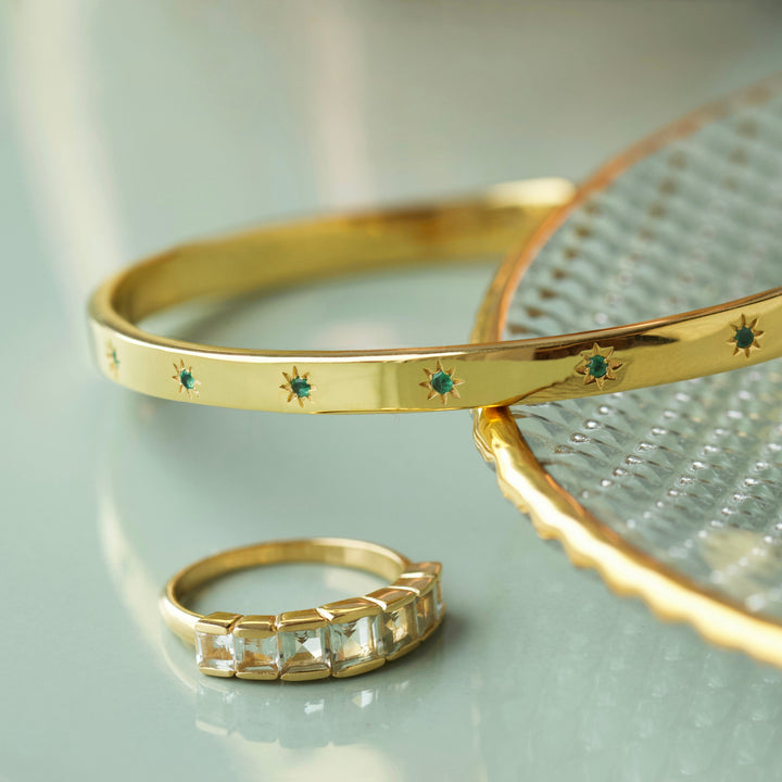 Made with 14k gold vermeil and graduated green amethyst stones. Designed for durability and comfort.