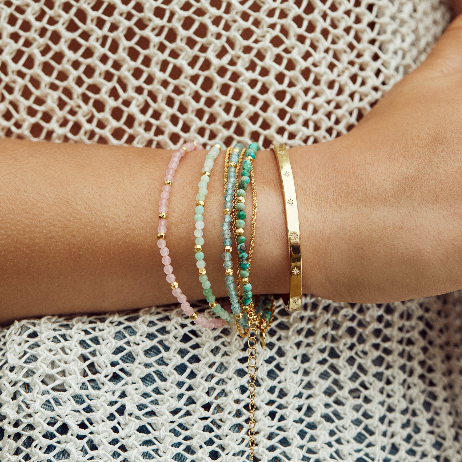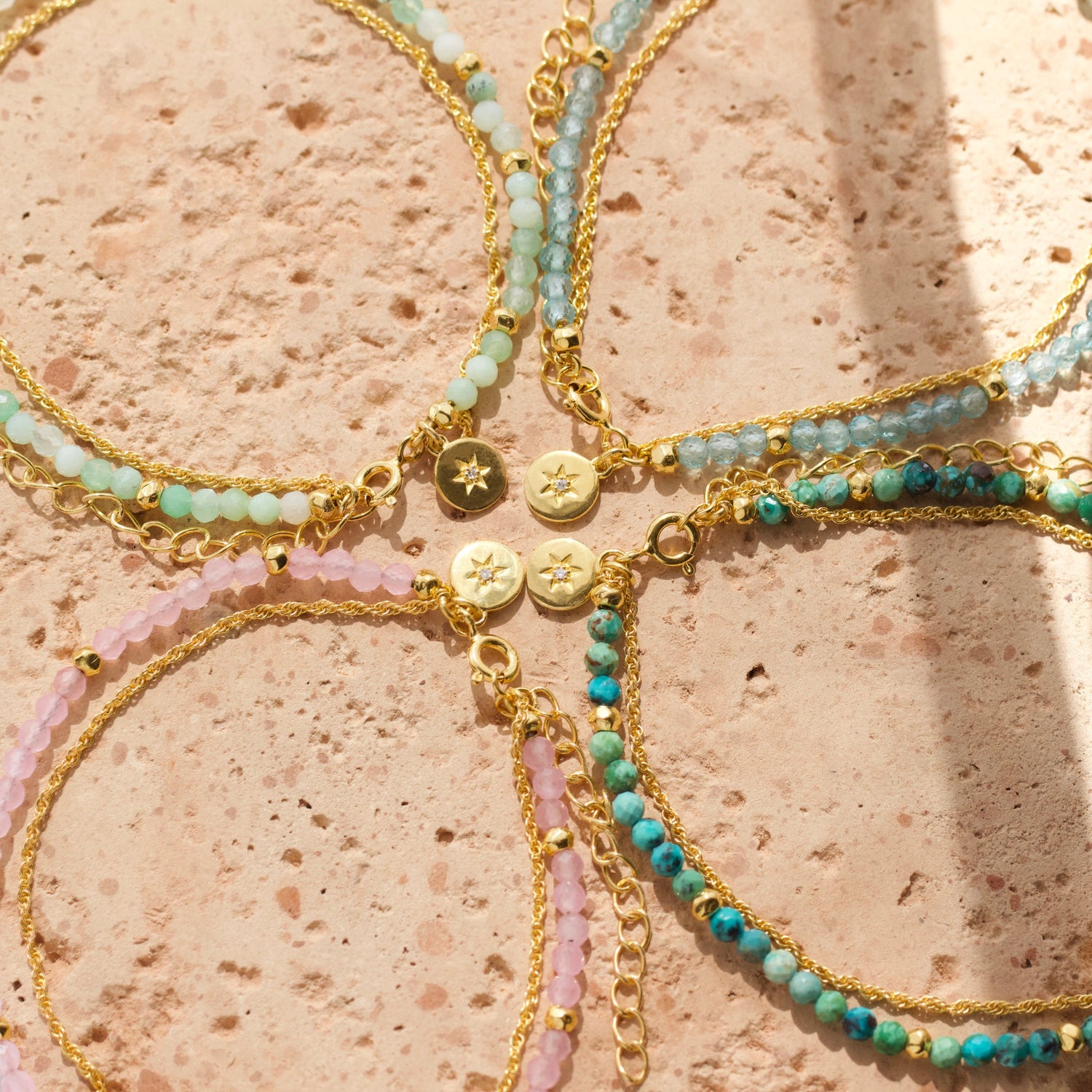 This Chrysoprase & Diamond Manifestation Bracelet by Carrie Elizabeth combines celestial elegance with meaningful design. Featuring faceted chrysoprase beads, a gemstone of balance and emotional healing, this bracelet is paired with a star-set diamond tag on a delicate gold vermeil chain. Ideal for navigating matters of the heart, it’s a perfect companion for everyday wear or as a symbolic gift for a loved one.