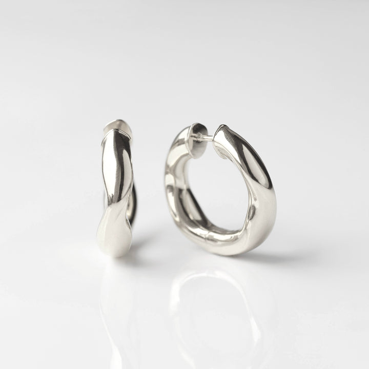 Silver-plated metal with a chunky organic shape. Secure and comfortable hoop closure.