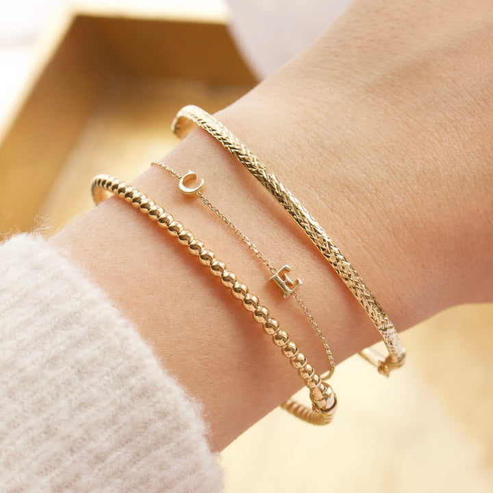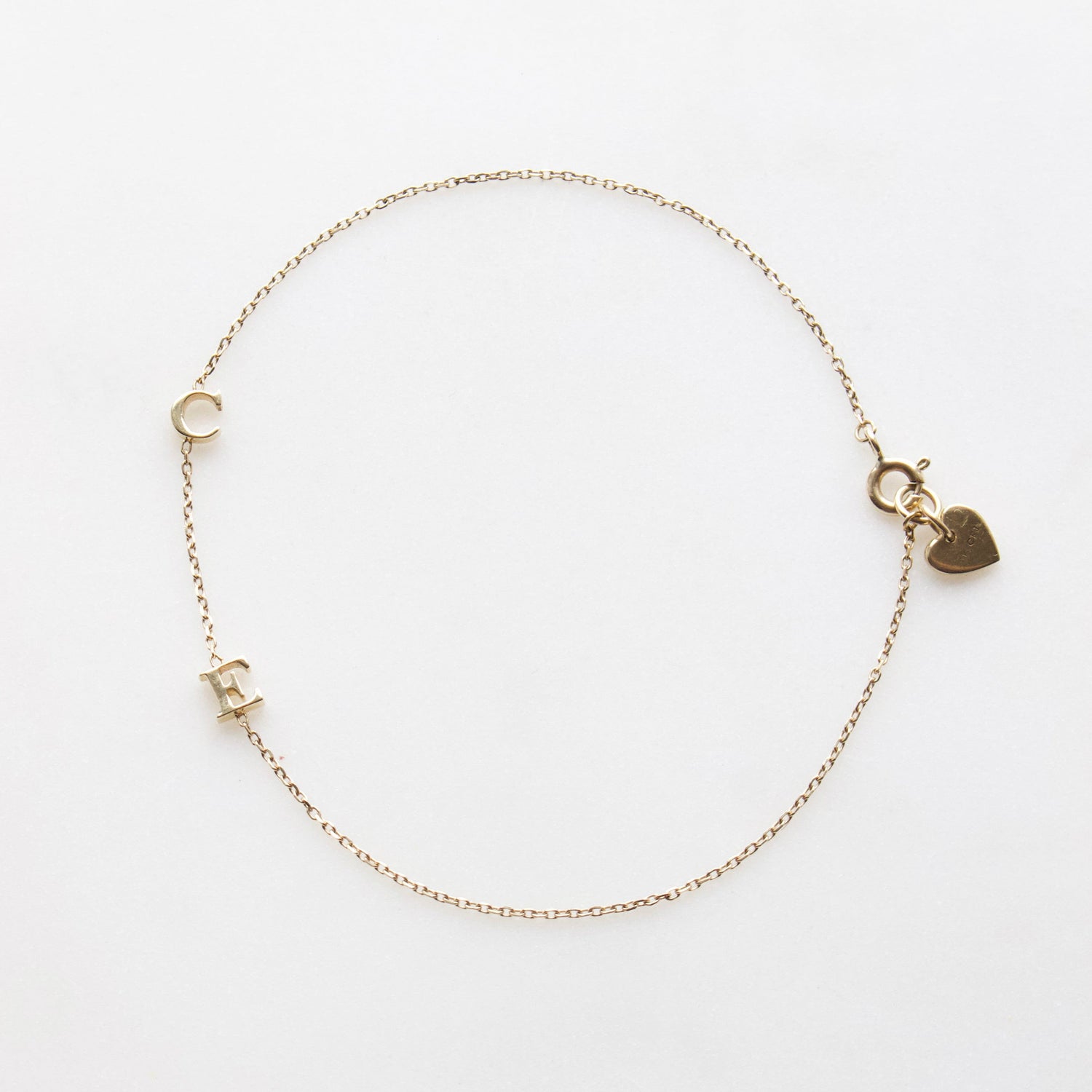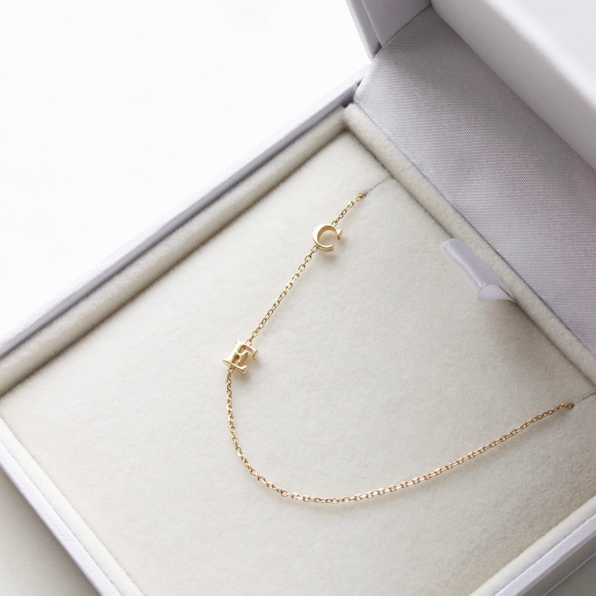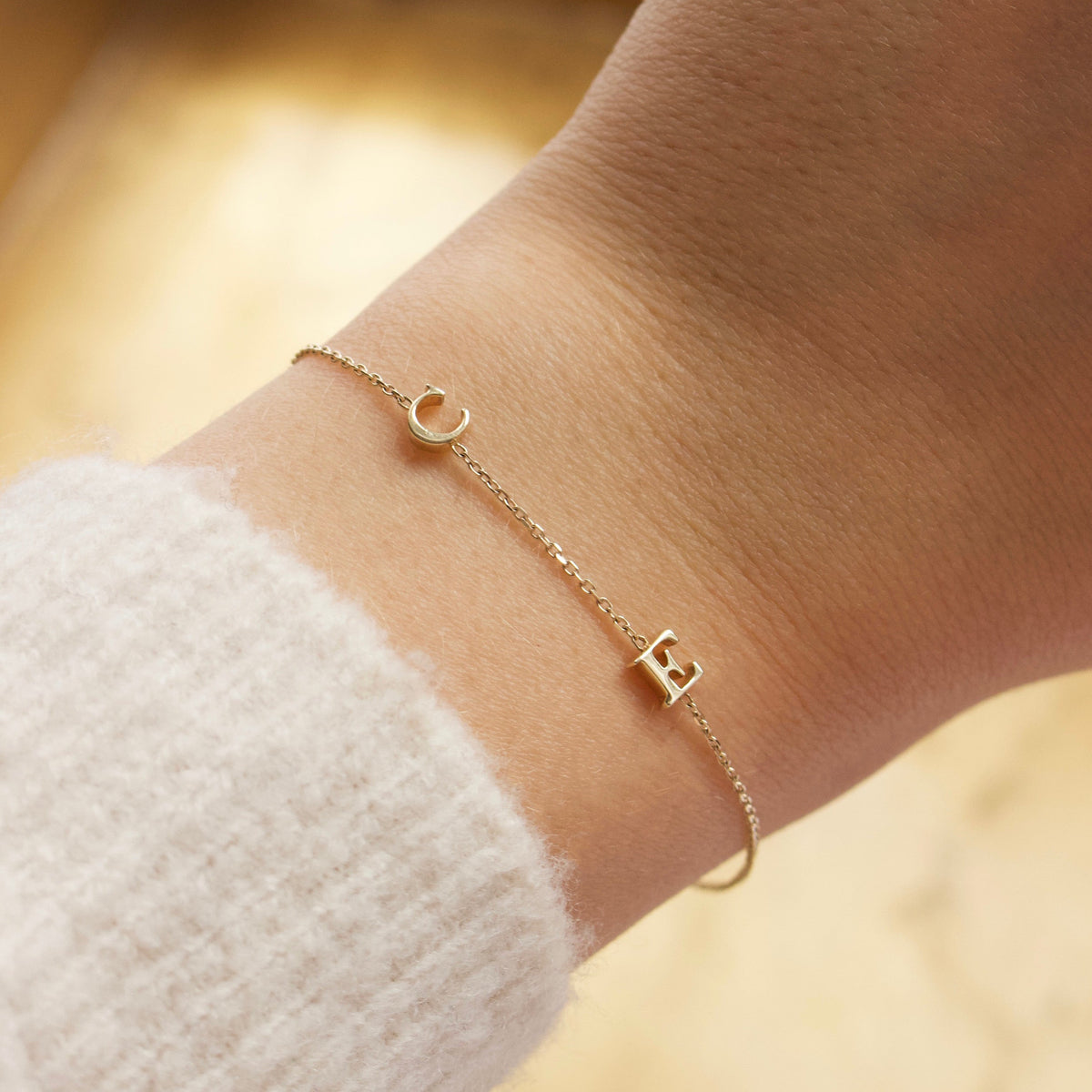 This Custom-Made Initial Bracelet by Carrie Elizabeth is a beautifully personalized piece designed to celebrate the initials of loved ones or meaningful words. Featuring 1 to 4 custom initials, this dainty bracelet is perfect for daily wear and crafted in 9k solid gold for lasting elegance.