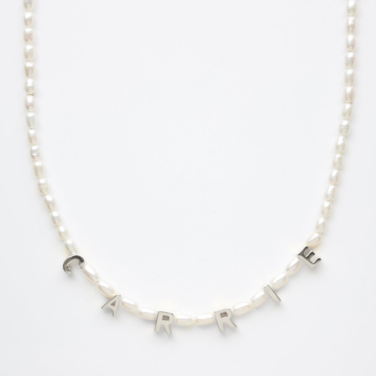 This Custom-Made Personalized Pearl Necklace by Carrie Elizabeth pairs timeless beauty with a unique touch. Made with iridescent freshwater pearls, it can be customized with 2-9 letters or a meaningful word, making it perfect for celebrating personal milestones or loved ones.