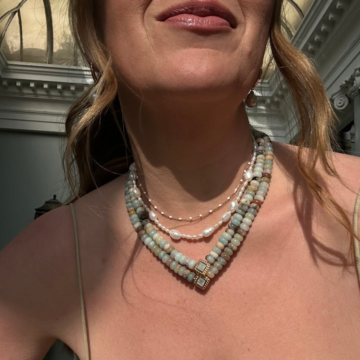 This Dainty Enamel Bead Necklace by Carrie Elizabeth in gold vermeil features soft white enamel drops, offering a subtle yet striking way to enhance your jewelry layers. Perfect for adding a lift to your everyday ensembles.