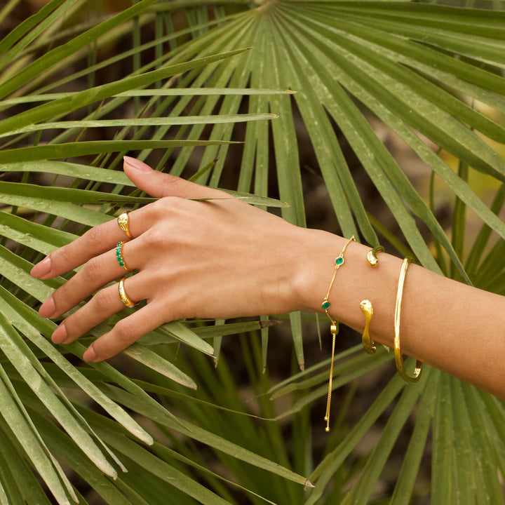 Handcrafted in 14k gold vermeil with semi-precious gemstones including Garnet, Amethyst, Aquamarine, White Topaz, Green Onyx, Pearl, Ruby, Peridot, Sapphire, Opal, Citrine, and Turquoise. Adjustable for a comfortable fit.