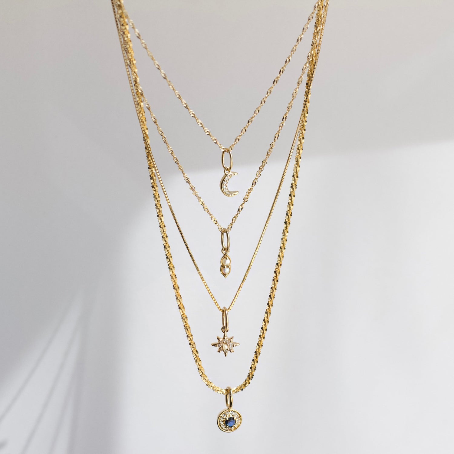 Handcrafted in 9k solid yellow gold, featuring ethically sourced diamonds. Designed to pair with chains such as the Singapore, Octagon box, or Petal chain.