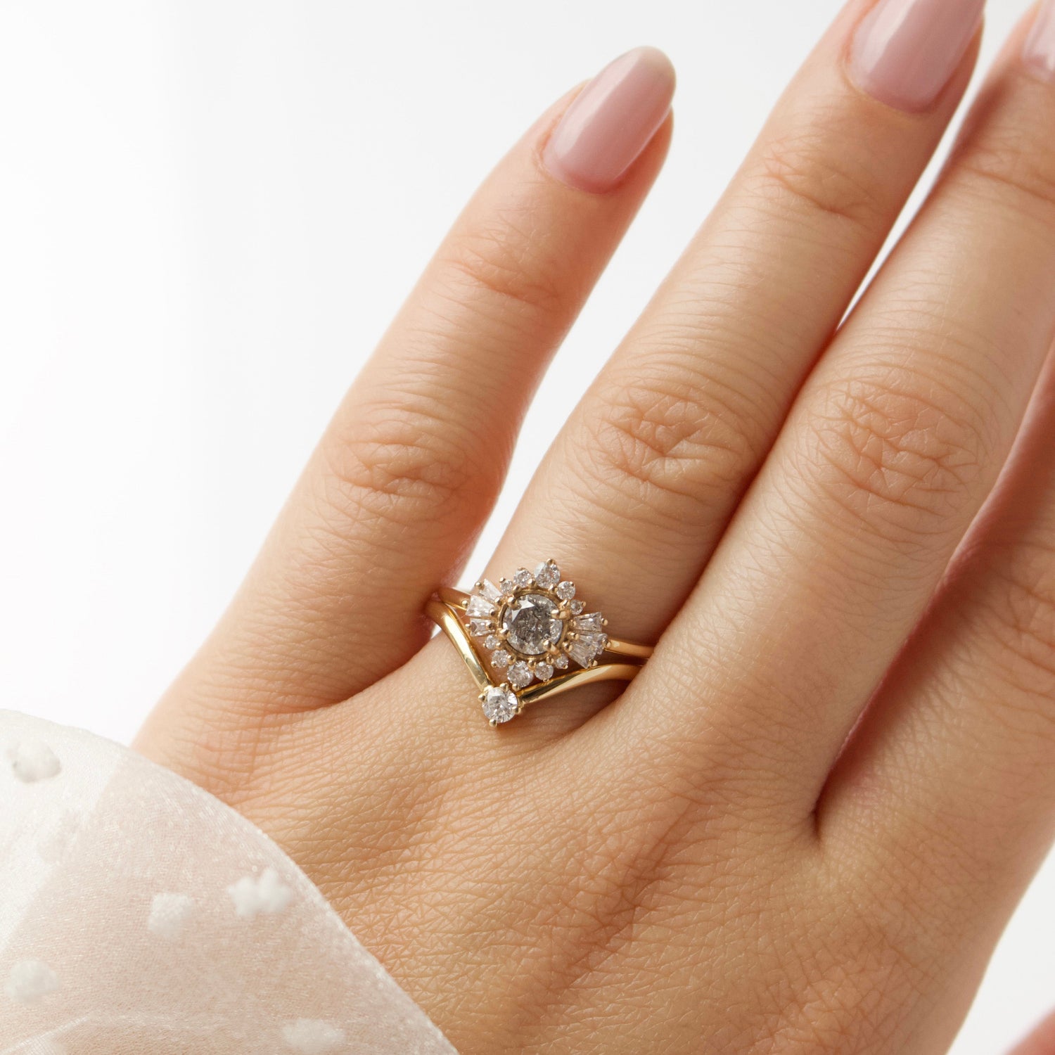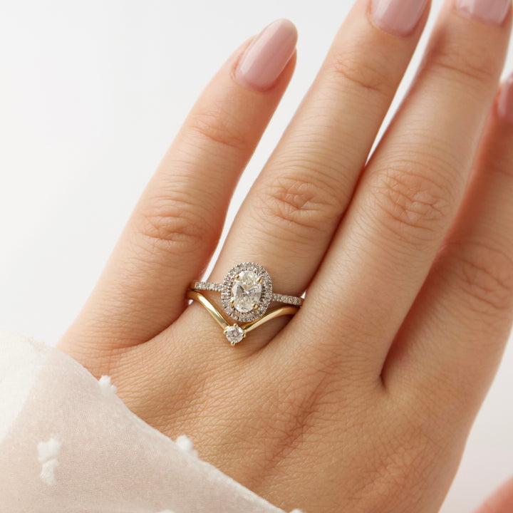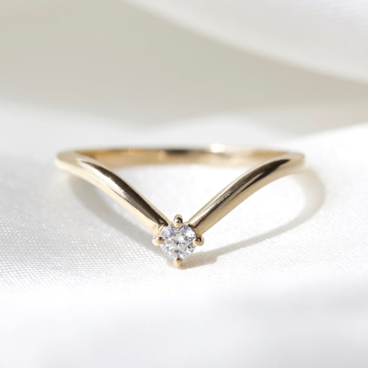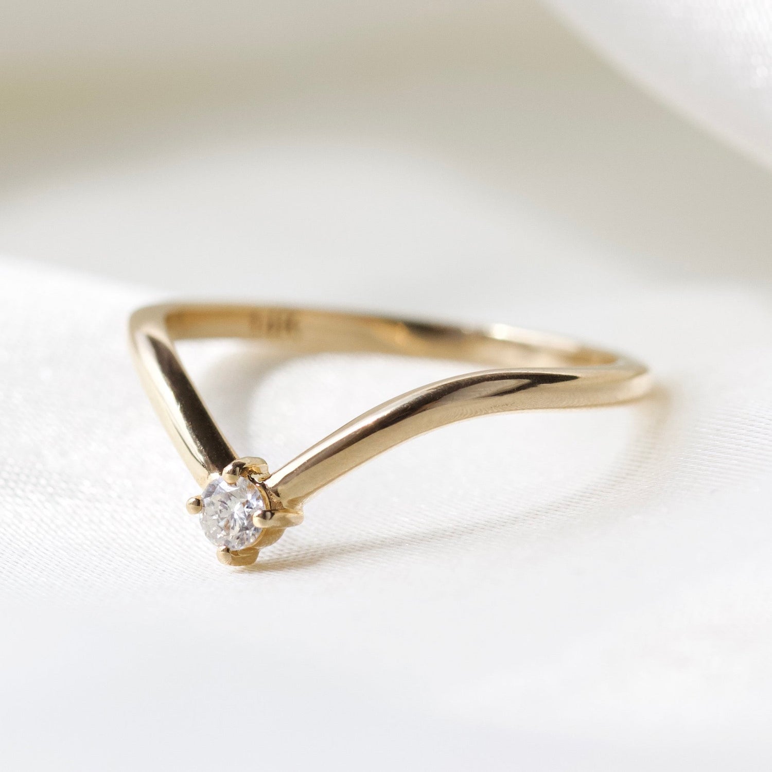 Handcrafted in 14k solid yellow gold, featuring an ethically sourced diamond set in a V-shaped band. Made to order with a lead time of 6-8 weeks. Complimentary resizing available within one UK size, excluding engraved items.