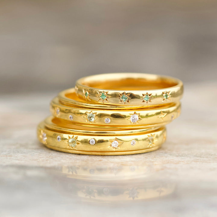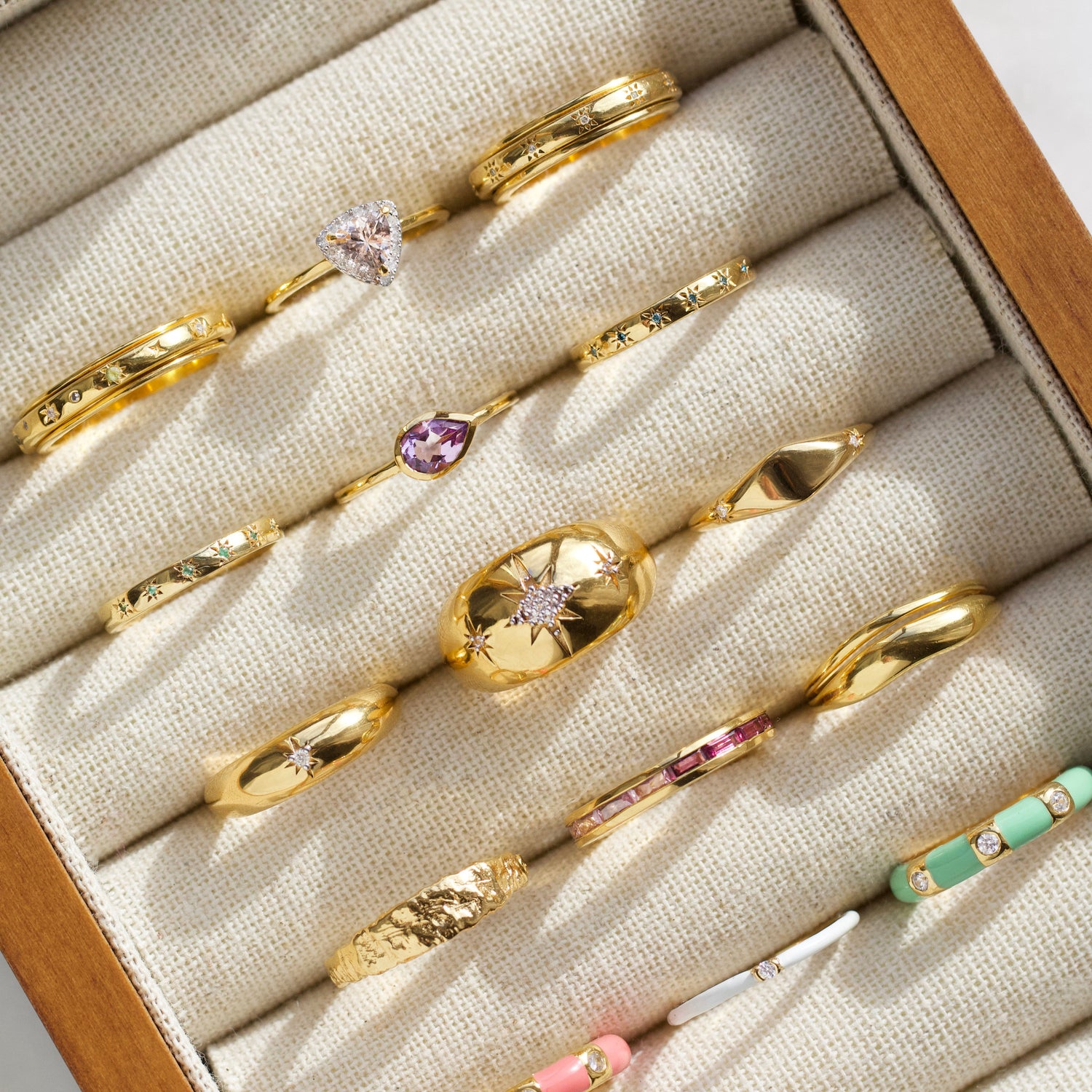 This Diamond Spinning Constellation Ring by Carrie Elizabeth combines celestial beauty with functionality. The band features sparkling diamond and peridot stones arranged in a star-set design, while the spinning element provides a calming distraction from anxiety and stress. Crafted to be a timeless, stackable piece, this ring not only offers elegance but also peace of mind for the wearer.