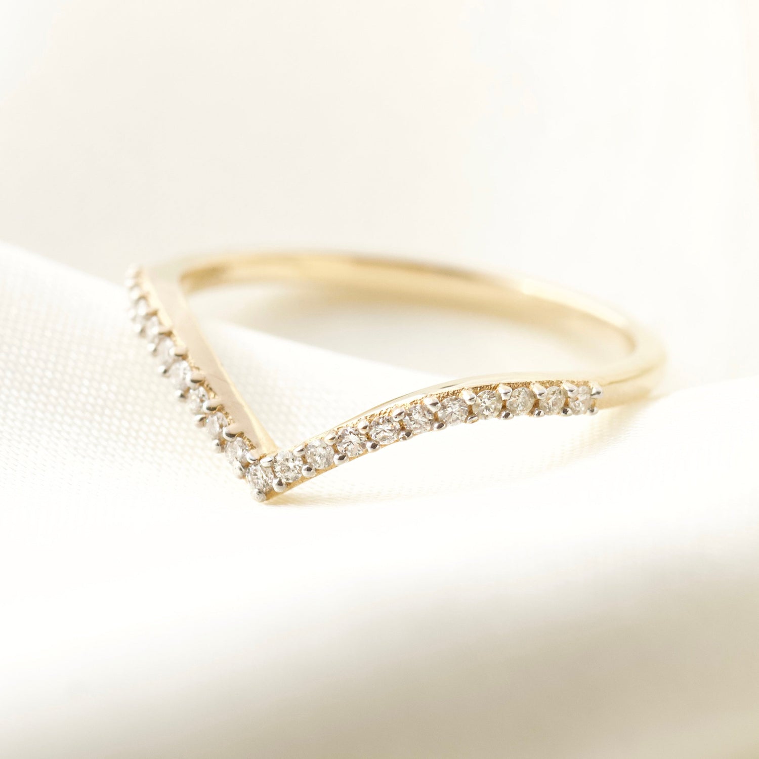 This Diamond Wishbone Stacking Ring by Carrie Elizabeth in 14k solid yellow gold blends vintage charm with modern elegance. The ring’s wishbone shape, adorned with diamonds, symbolizes the promise of love and prosperity. A perfect fit for stacking or wearing solo, it’s a versatile piece that adds a delicate sparkle to any look. Each ring is crafted with care by artisans in Jaipur, India, ensuring quality and craftsmanship in every piece. This stunning ring will be a cherished addition to your collection for years to come.