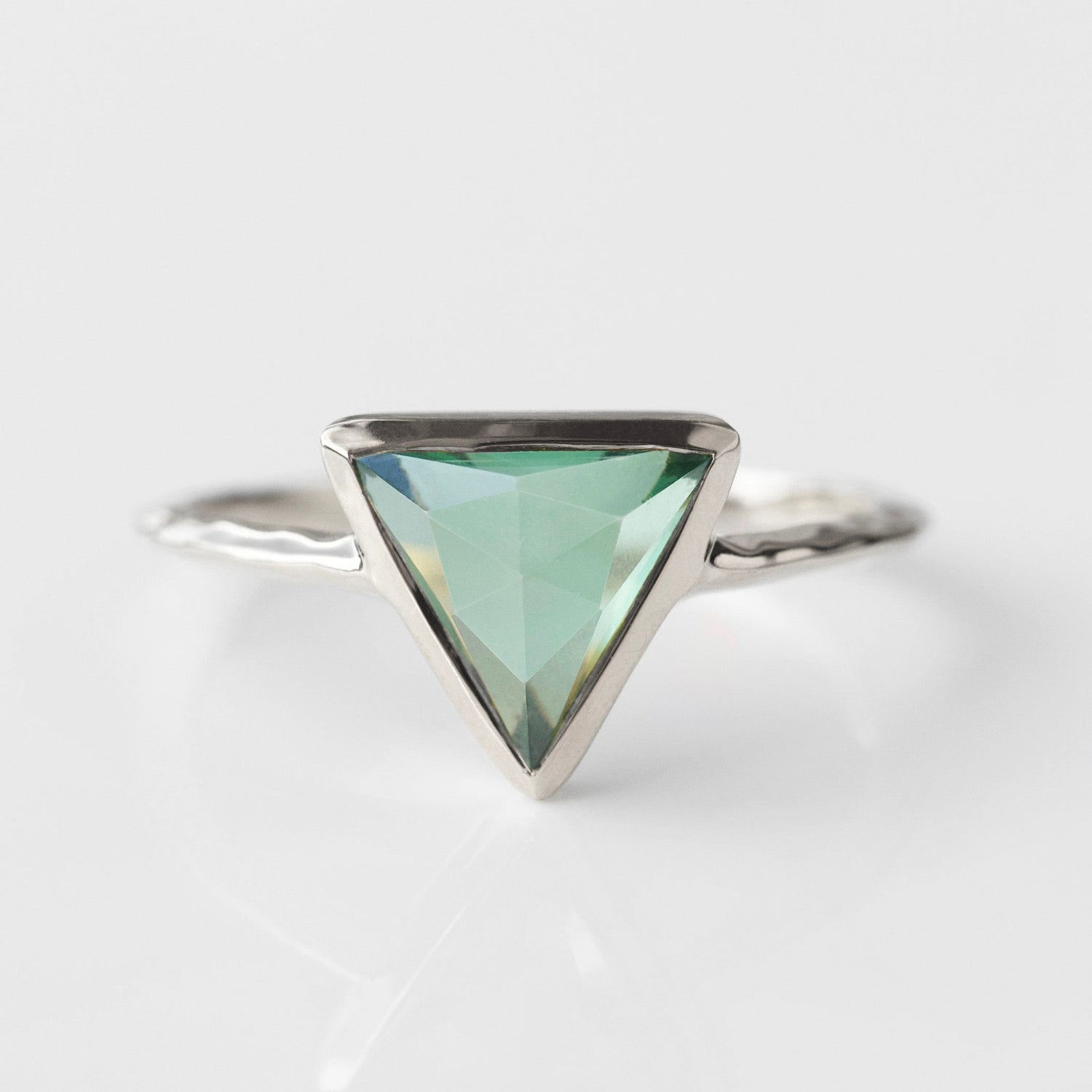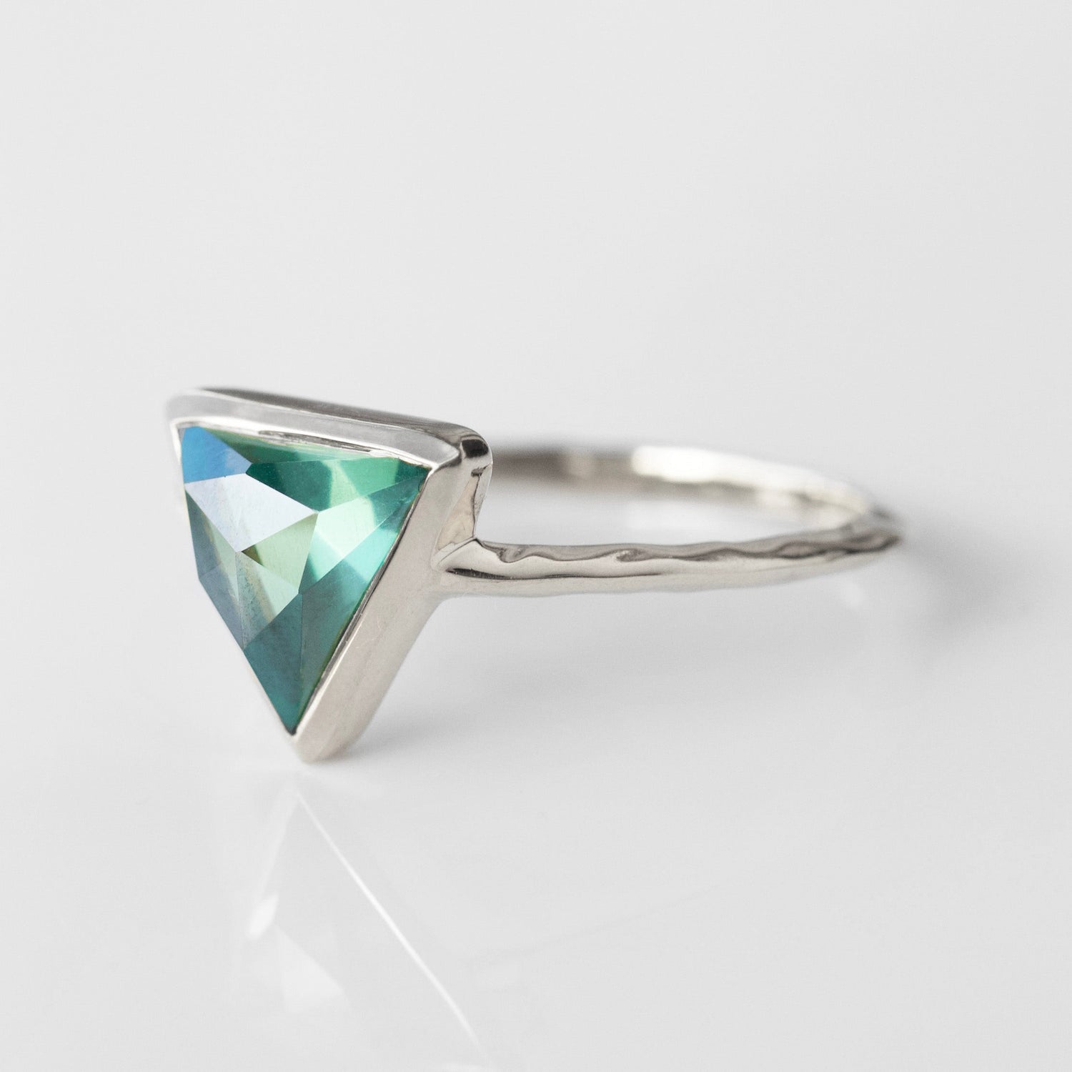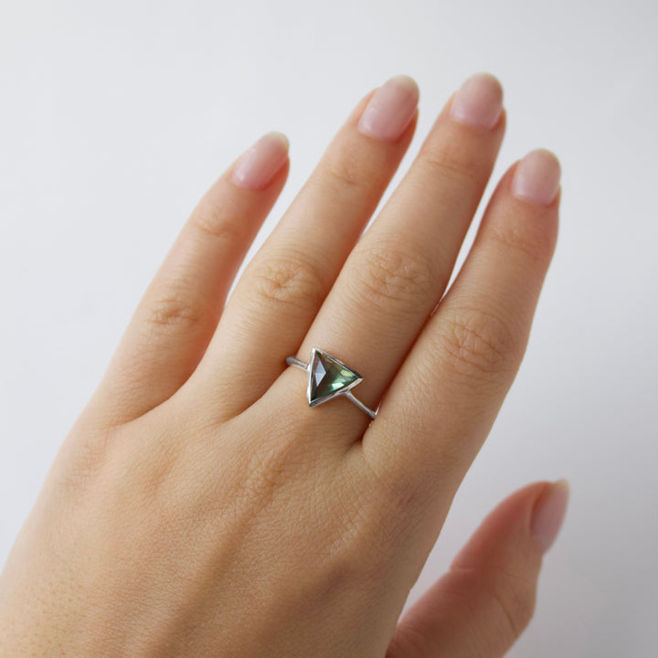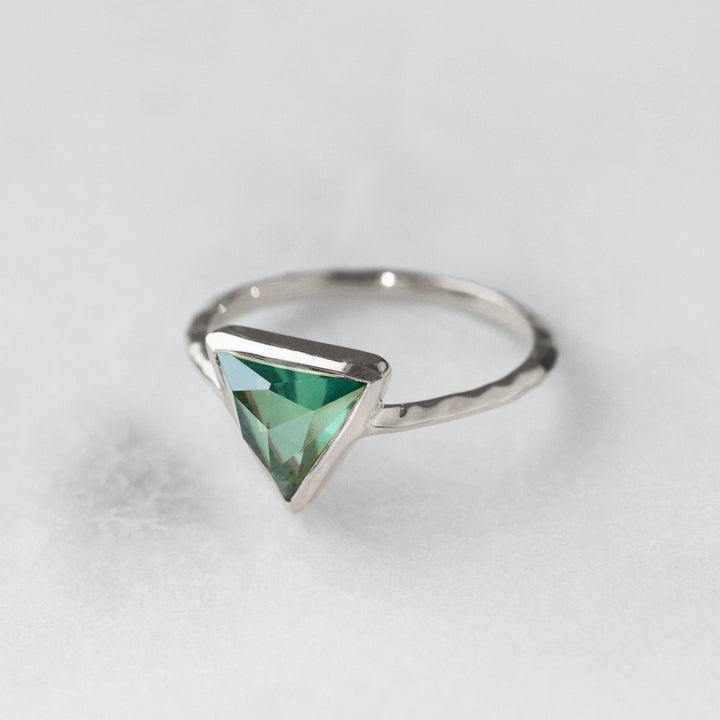 This Farrah Fern Green Topaz Ring by Carrie Elizabeth is a reimagined iconic piece, featuring a stunning fern green topaz stone set in a triangle shape. The knife-edge band enhances the design’s modern appeal, while the vibrant blue and green tones of the topaz shimmer in the light, adding a dynamic touch. Known for its ability to recharge optimism and promote forgiveness, green topaz is both a beautiful and meaningful gemstone. This elegant ring is perfect for everyday wear or as a statement piece.