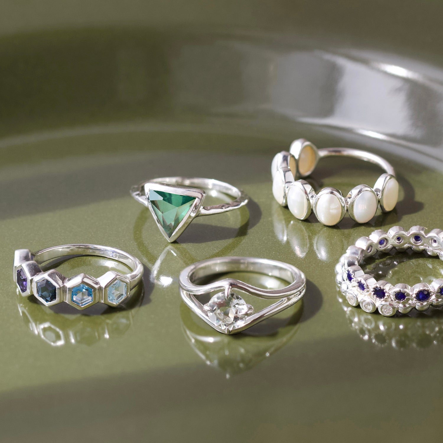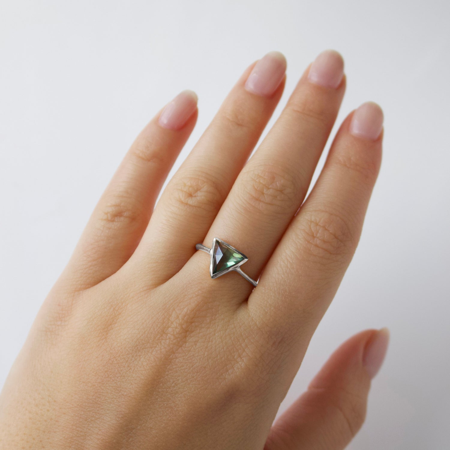 Crafted in sterling silver with a fern green topaz stone. Available in custom sizes.