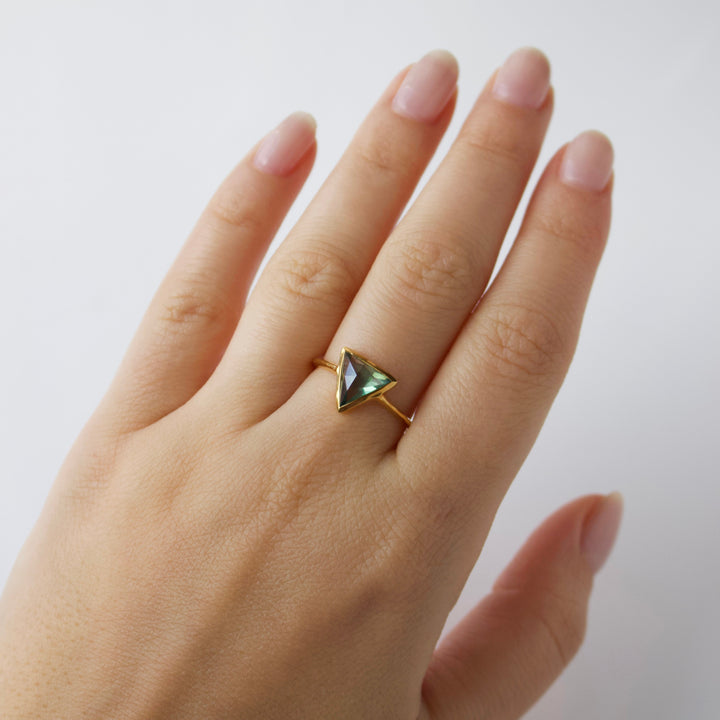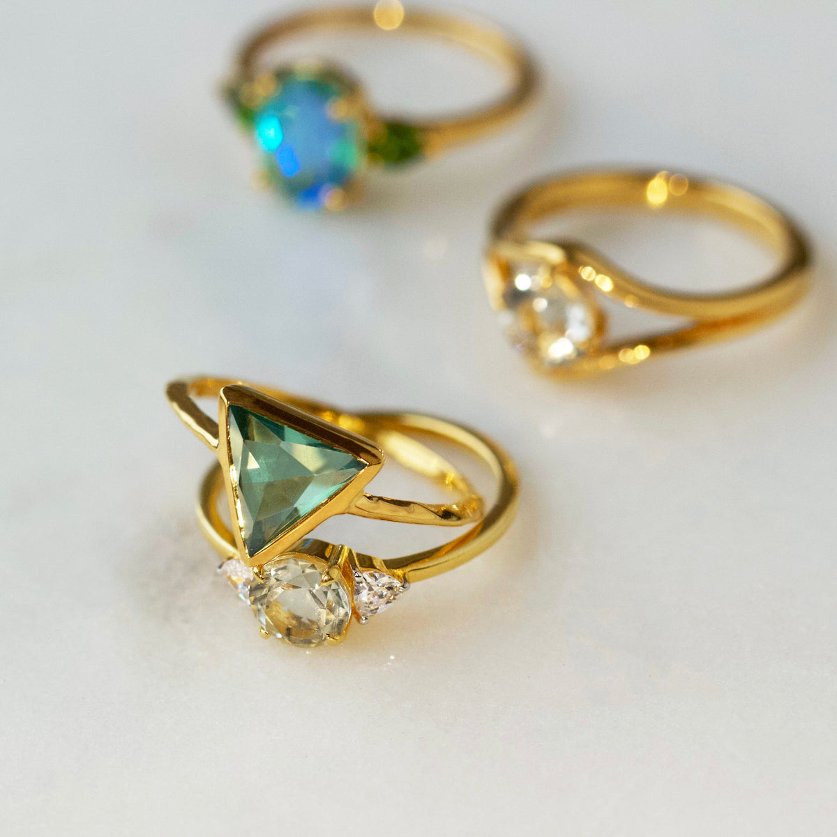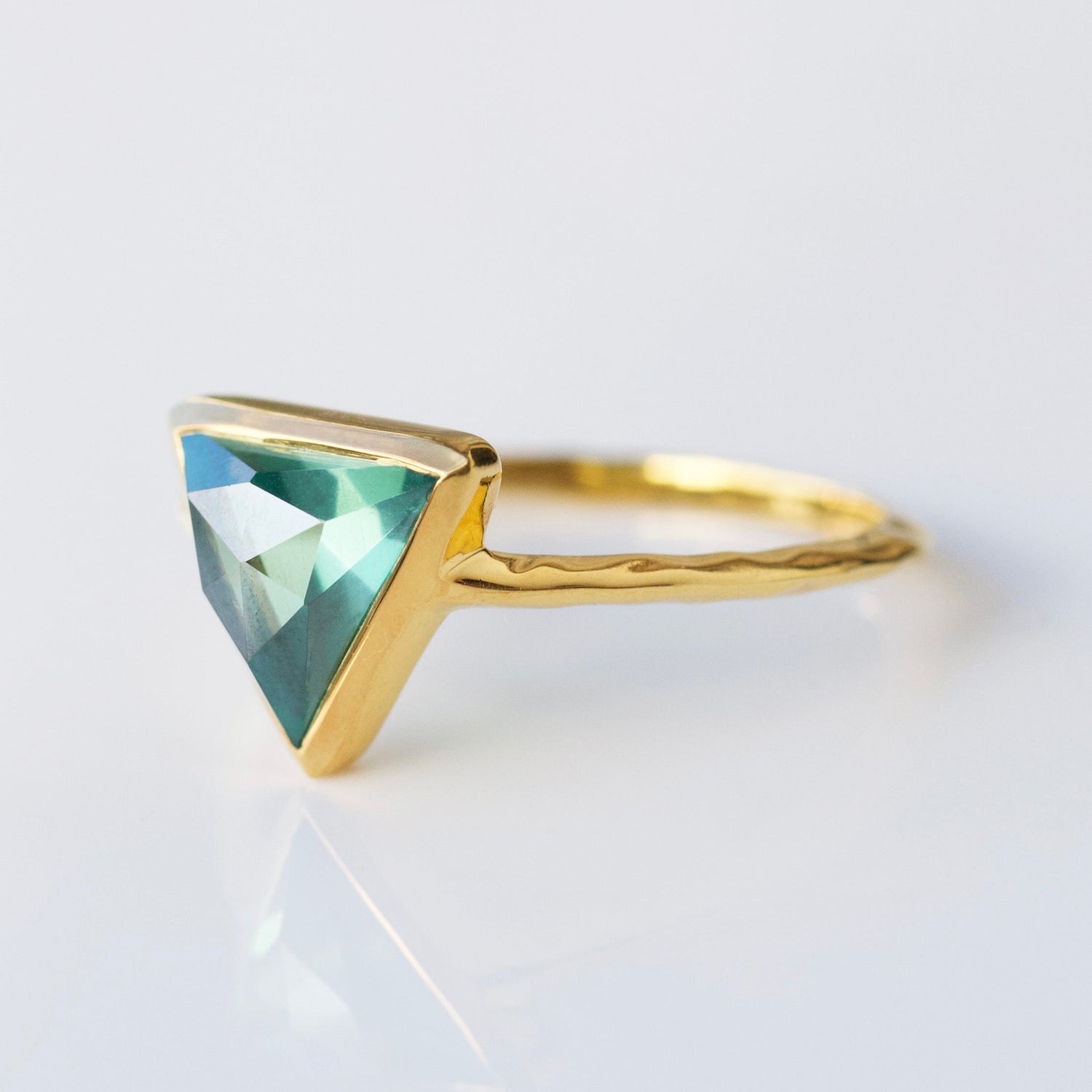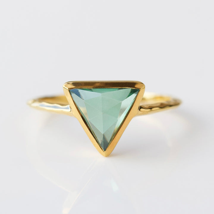 This Farrah Fern Green Topaz Ring by Carrie Elizabeth in 14k gold vermeil takes the classic design to new heights, showcasing the same mesmerizing fern green topaz set in a modern triangle shape. The knife-edge band adds a refined touch, making this ring a perfect combination of luxury and style. The green topaz stone is symbolic of optimism and healing, making it a meaningful gift or a personal keepsake.