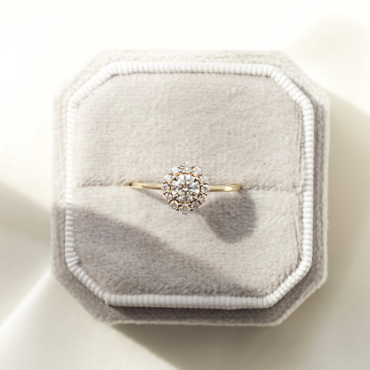 This Flora Moissanite & Diamond Cluster Ring by Carrie Elizabeth is an exquisite vintage-inspired piece, designed as part of the Written in the Stars collection. The center features a brilliant moissanite stone surrounded by a cluster of sparkling diamonds, set in luxurious 14k solid yellow gold. This ring is a timeless symbol of love and commitment, perfect for engagements or special occasions. The moissanite’s brilliance and the diamonds’ sparkle make it a showstopper for any setting.