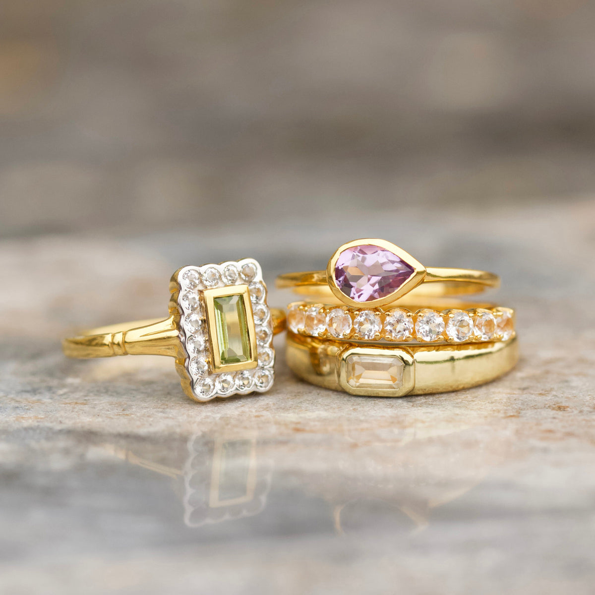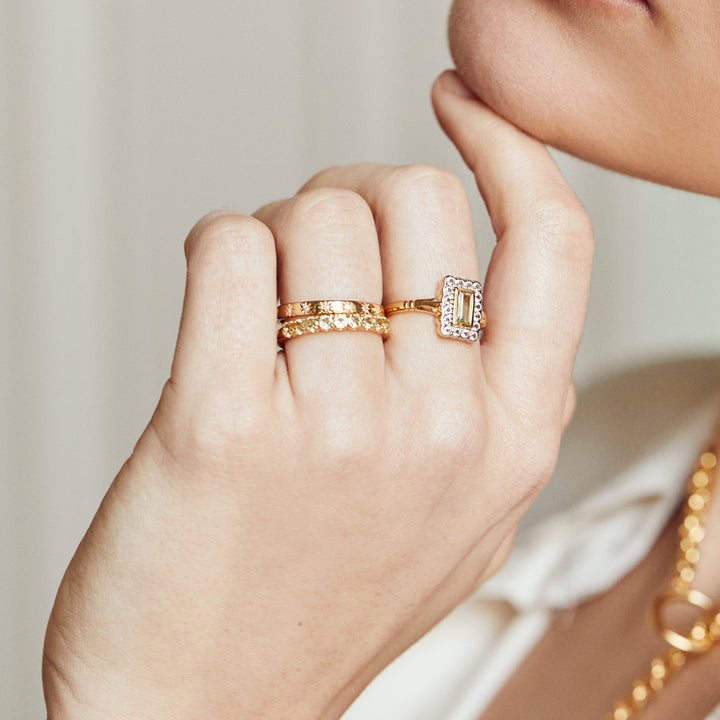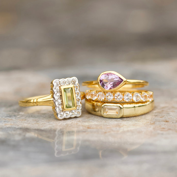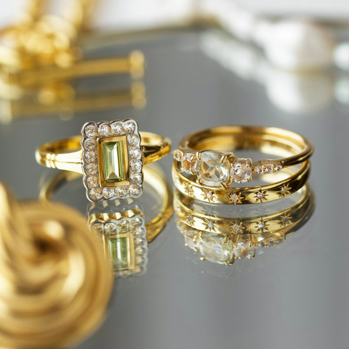 This Florence Vintage Peridot Ring by Carrie Elizabeth is a beautiful tribute to vintage design. The vibrant peridot center stone is surrounded by sparkling white topaz stones, creating a timeless and elegant ring. Known for its manifestation properties, peridot symbolizes growth and prosperity, making this an ideal ring for those seeking a meaningful, elegant accessory.