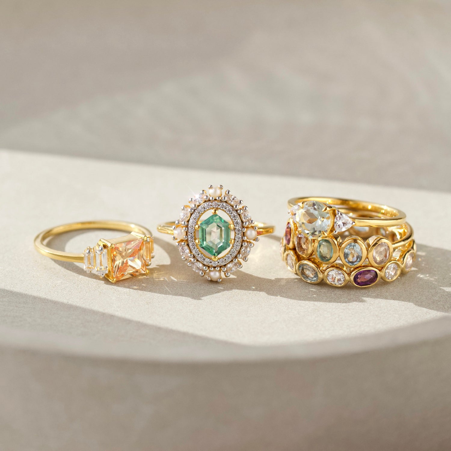 Crafted in 14k gold vermeil with fern green topaz (7x5mm), pearls, and cubic zirconia. Band width: 1.3mm. Setting size: 15.5x13.5mm.