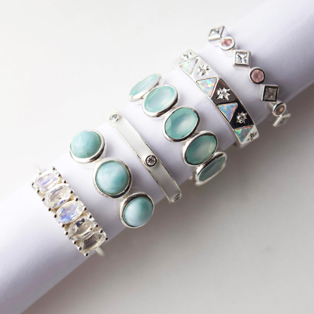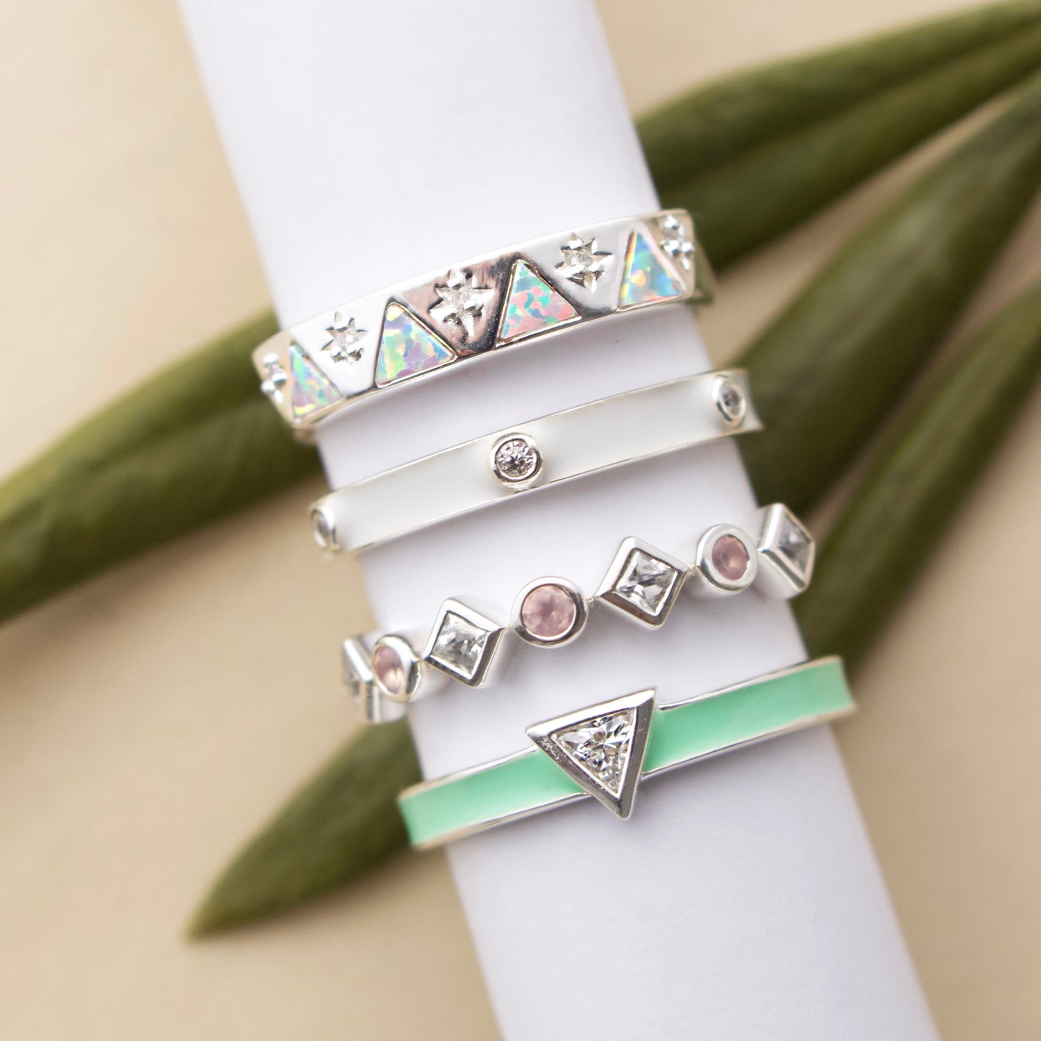 The Izar Opal & Diamond Band by Carrie Elizabeth Jewelry in Sterling Silver is an exquisite band that glistens with opals and diamonds, creating a stunning array of pastel rainbow colors. Ideal for both daily wear and special occasions, this piece shines brilliantly, whether worn alone or stacked with other bands. The opals symbolize creativity and the diamonds add sparkle, making this a timeless and versatile piece.