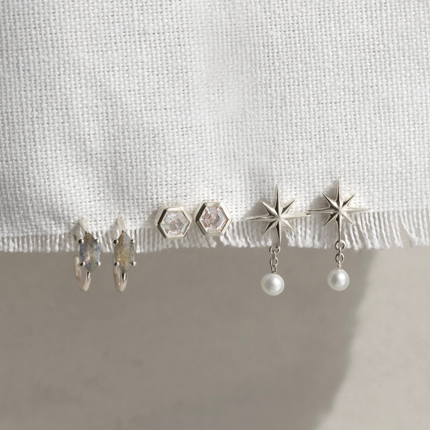 Crafted in sterling silver, featuring marquise-shaped labradorite gemstones. Earrings measure approximately 2.5 cm in length.