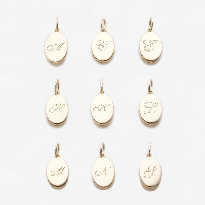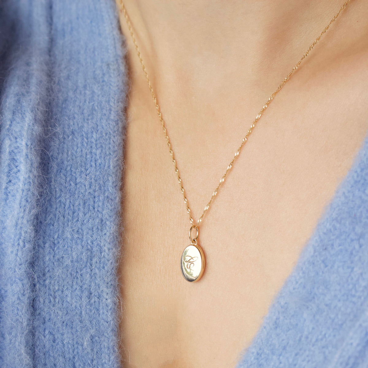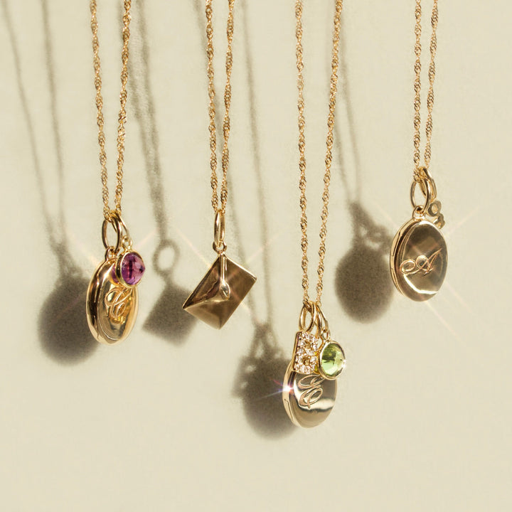 Crafted in 9k solid yellow gold. Available in multiple styles, including birthstones, plain initials, and coins. Pairs beautifully with chains like the 9k Singapore chain, Octagon box chain, or Petal chain.
