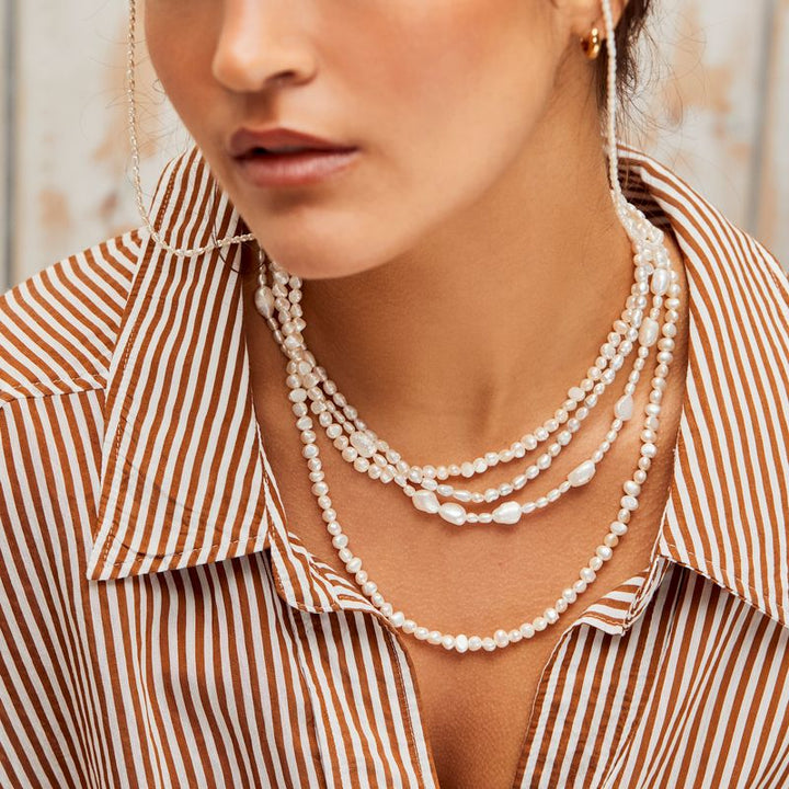 Crafted in gold-plated metal, featuring iridescent pearl beads. Necklace length: 120 cm, adjustable for different styles.