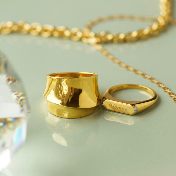 The Louise Thompson Lucky Diamond Signet in 14k Gold Vermeil is part of the LUCKY collection, symbolizing resilience and protection. Signet rings are traditionally believed to carry the power of the wearer, and this design is no exception. The engraving can represent personal identity and values. The piece can be personalized with a name or word up to eight letters, adding a special touch to an already meaningful piece.