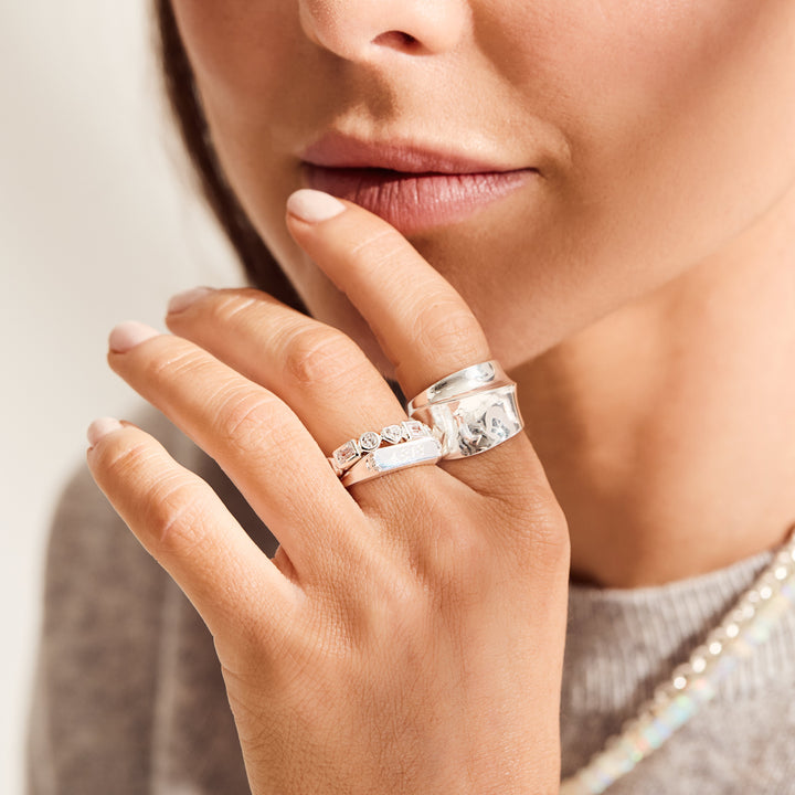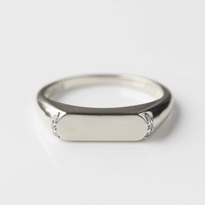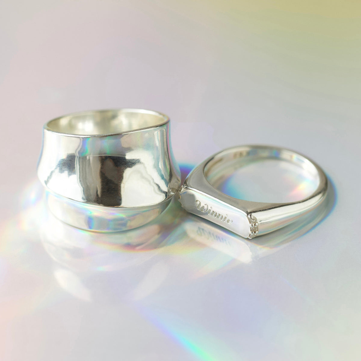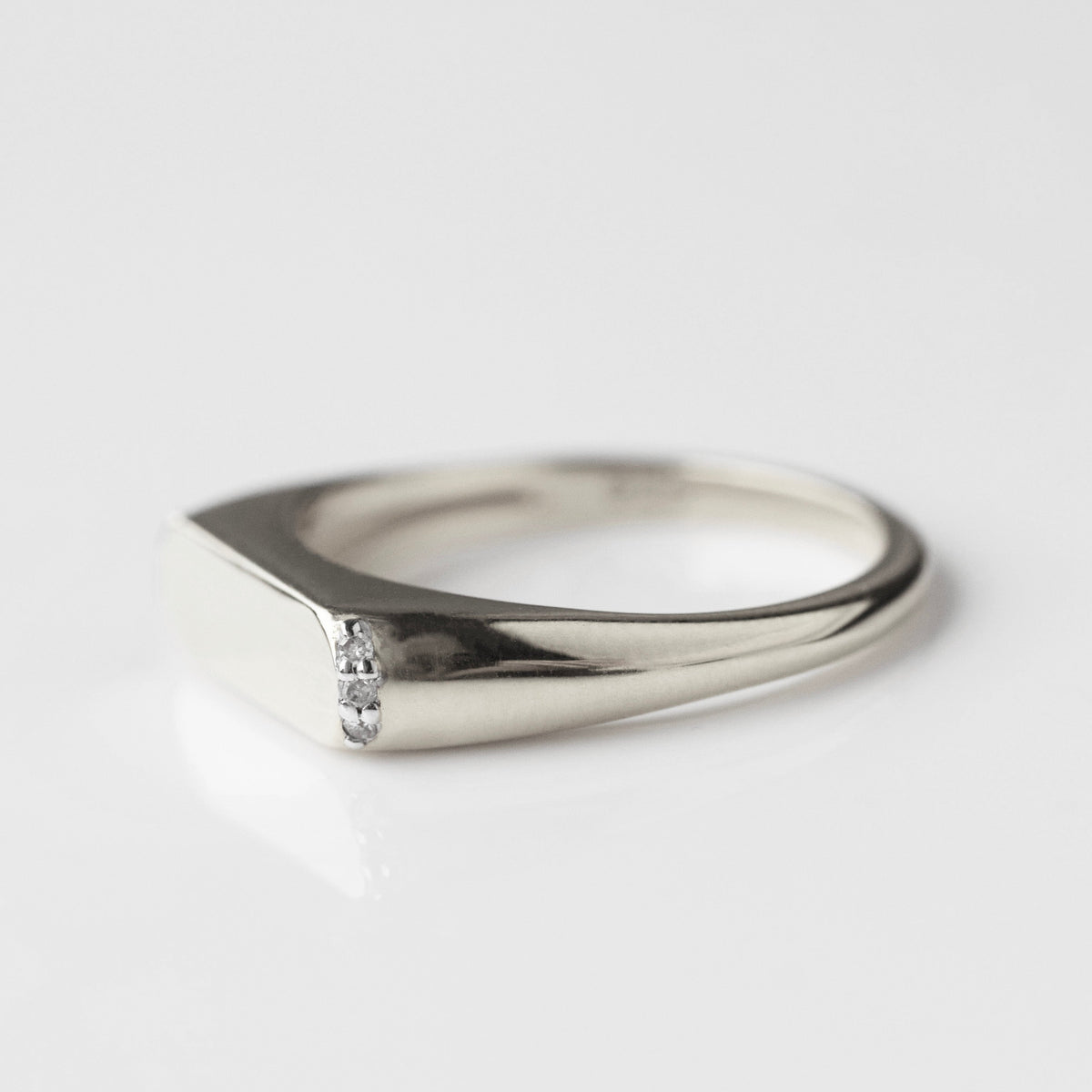 The Louise Thompson Lucky Diamond Signet in Sterling Silver mirrors the empowering message of the gold vermeil version but in sterling silver. This ring is ideal for those seeking a personal and protective symbol. The signet can be engraved with a meaningful word or name, making it a unique piece that holds both emotional and symbolic value.