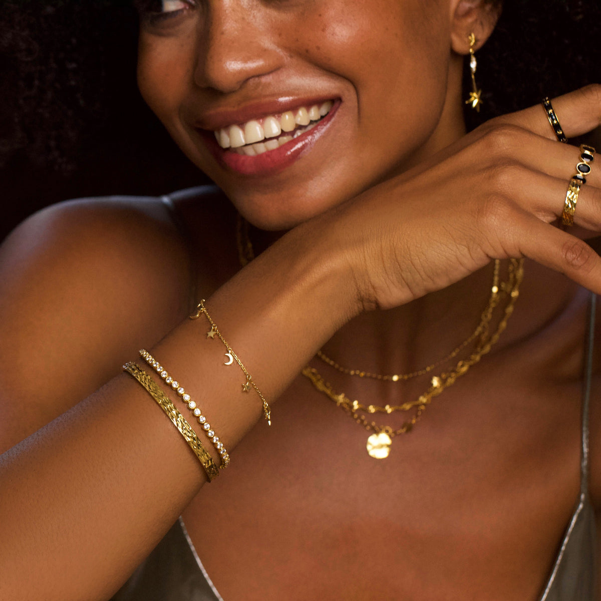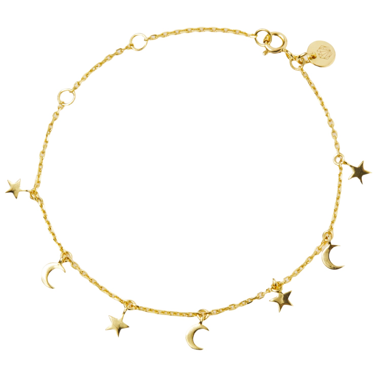 Handcrafted in 14k gold vermeil, featuring delicate moon and star charms. Adjustable chain measures 19cm in total length, ensuring a comfortable and tailored fit. Ethically made by skilled artisans in Jaipur, India.