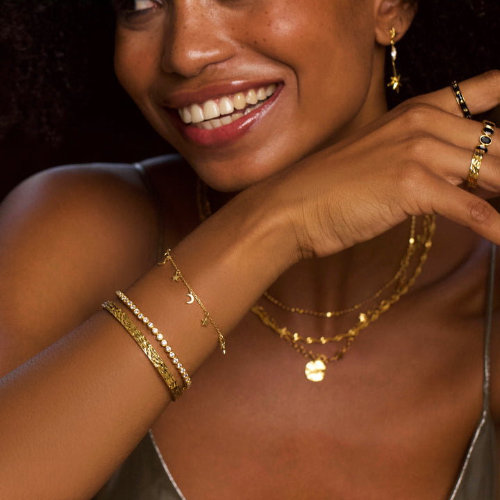 This Mini Moon & Stars Charm Bracelet by Carrie Elizabeth brings celestial charm to your wrist with its delicate moon and star motifs. Perfectly capturing the magic of the night sky, the bracelet glistens beautifully in the light, adding a cosmic touch to your everyday look. Designed for versatility, it looks stunning on its own or stacked with your favorite cuffs and bracelets. A perfect gift for a loved one or a treat for yourself, this bracelet offers both whimsy and elegance.