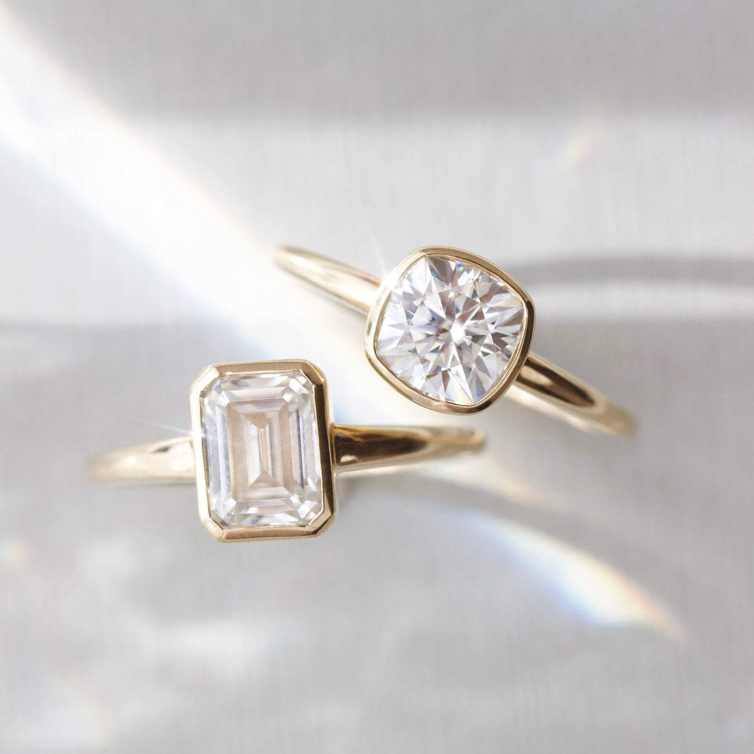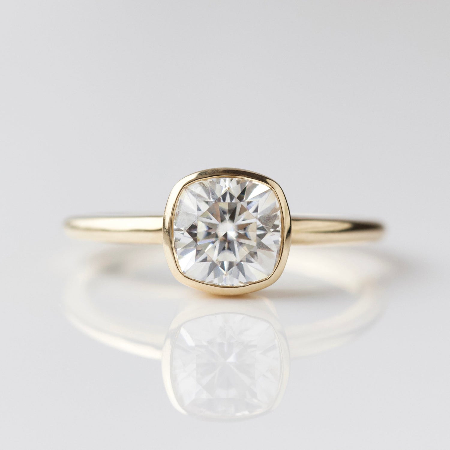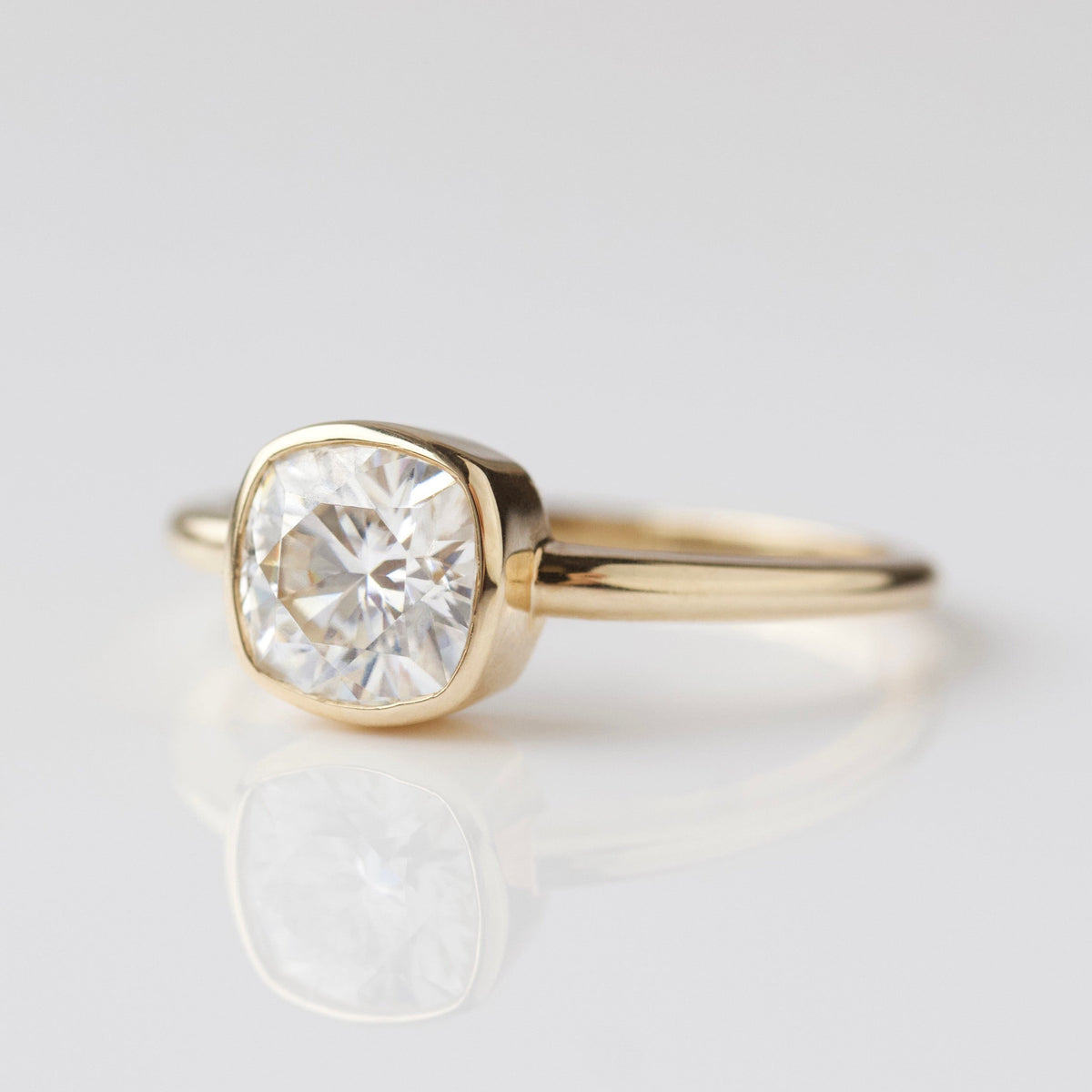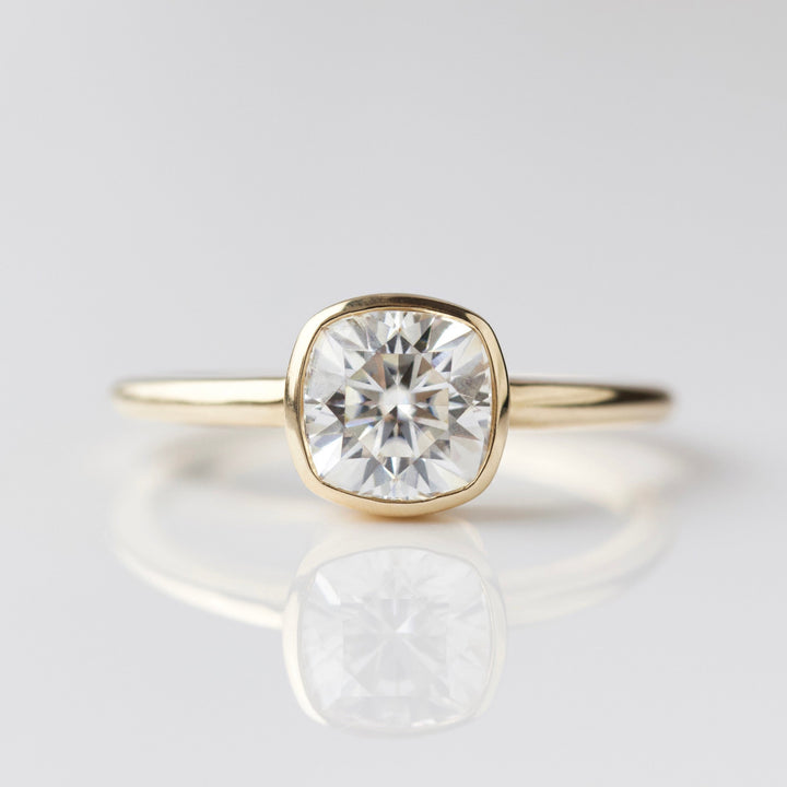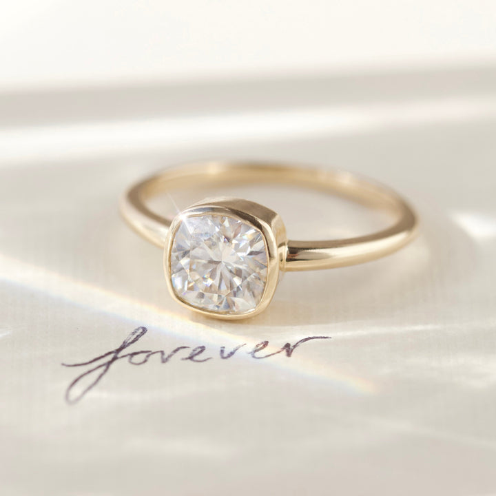 This Moissanite Cushion Cut Bezel Set Ring by Carrie Elizabeth exudes timeless sophistication and sparkle. Featuring a stunning cushion-cut moissanite, this piece combines modern elegance with lasting durability. Moissanite, a brilliant alternative to diamonds, is celebrated for its unique characteristics and dazzling fire. Perfect for special occasions or as a treasured everyday accessory, this ring is crafted to be a symbol of love and luxury for a lifetime.