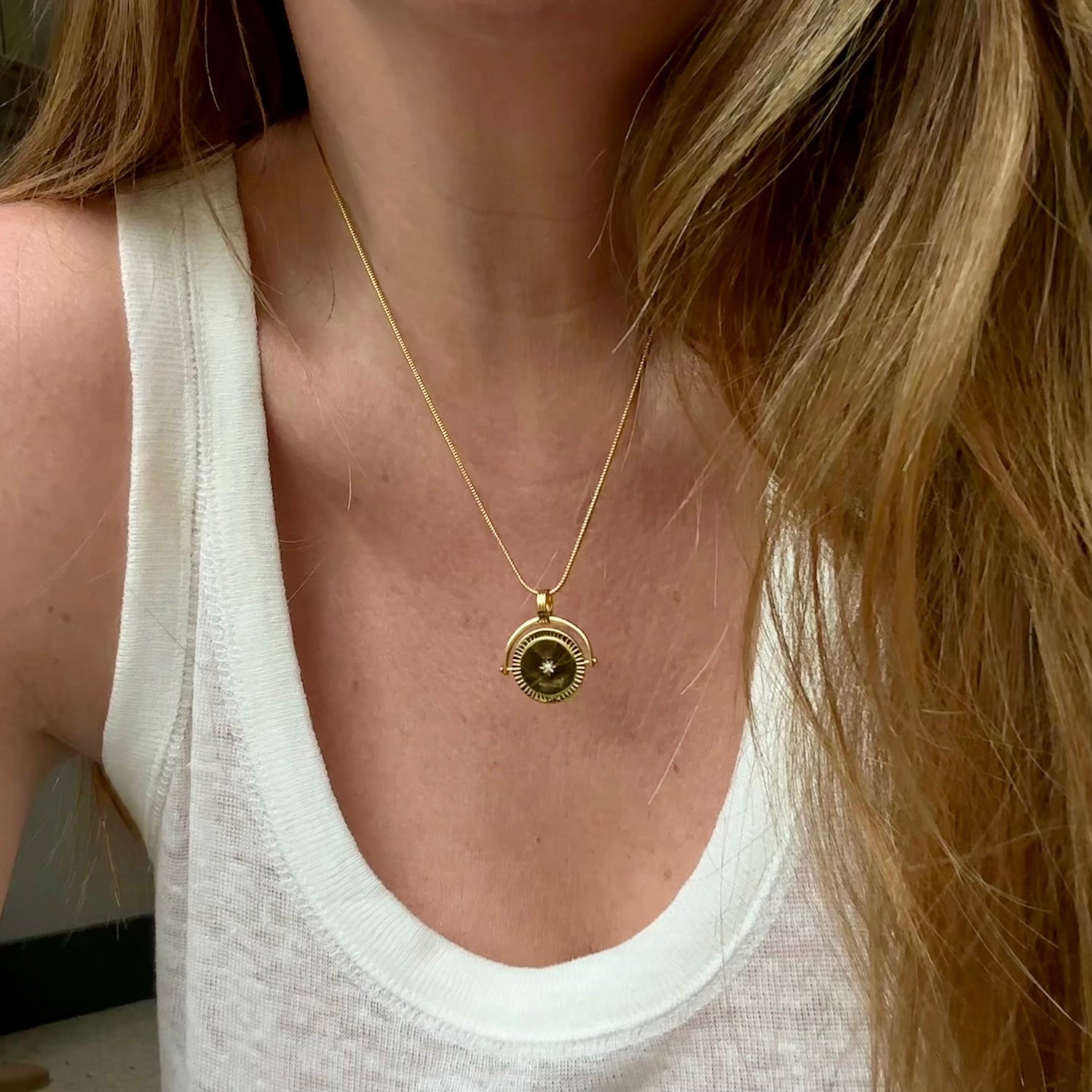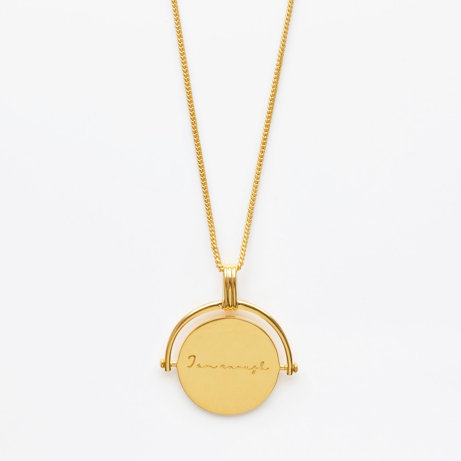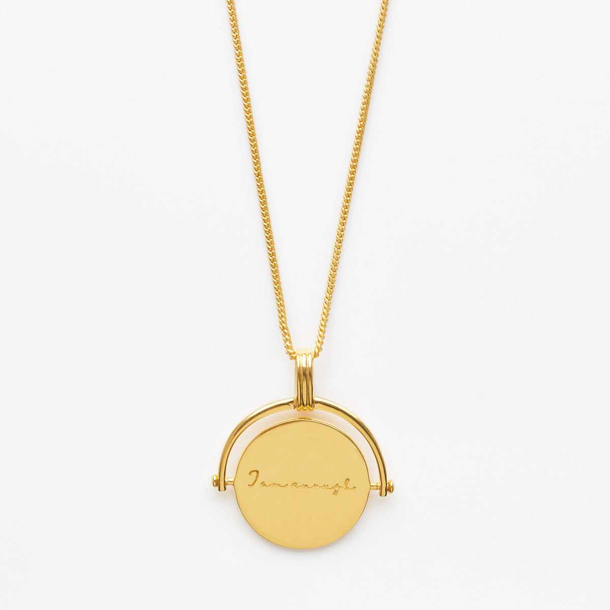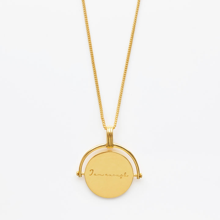 Crafted in gold-plated metal, featuring a star-set moissanite gemstone on one side and an engraved affirmation on the other. Includes a durable chain for comfortable, everyday wear.
