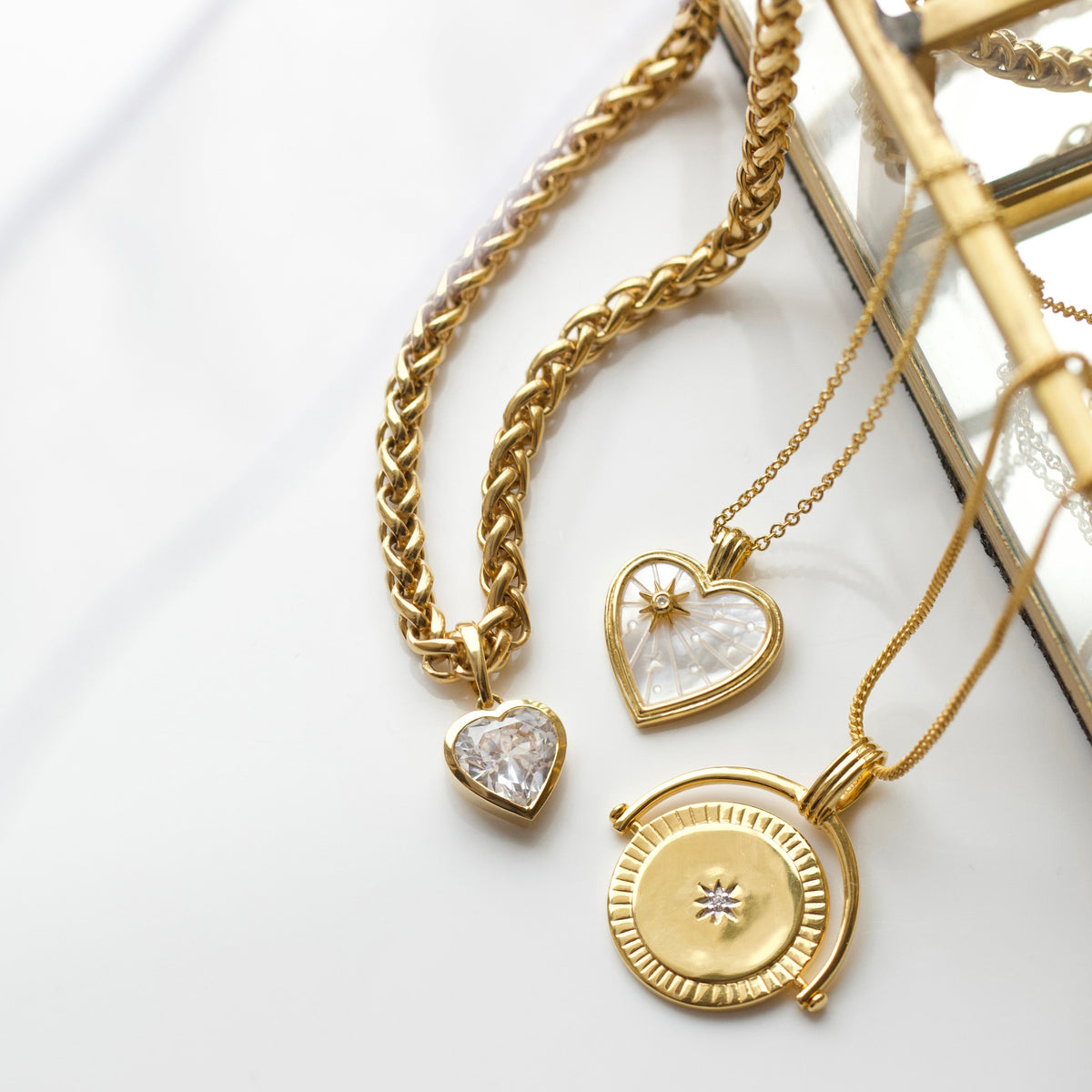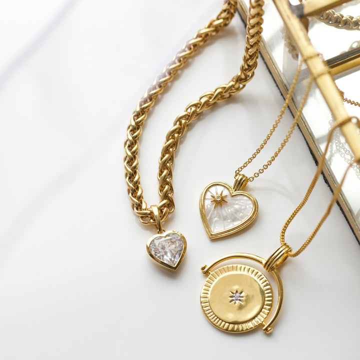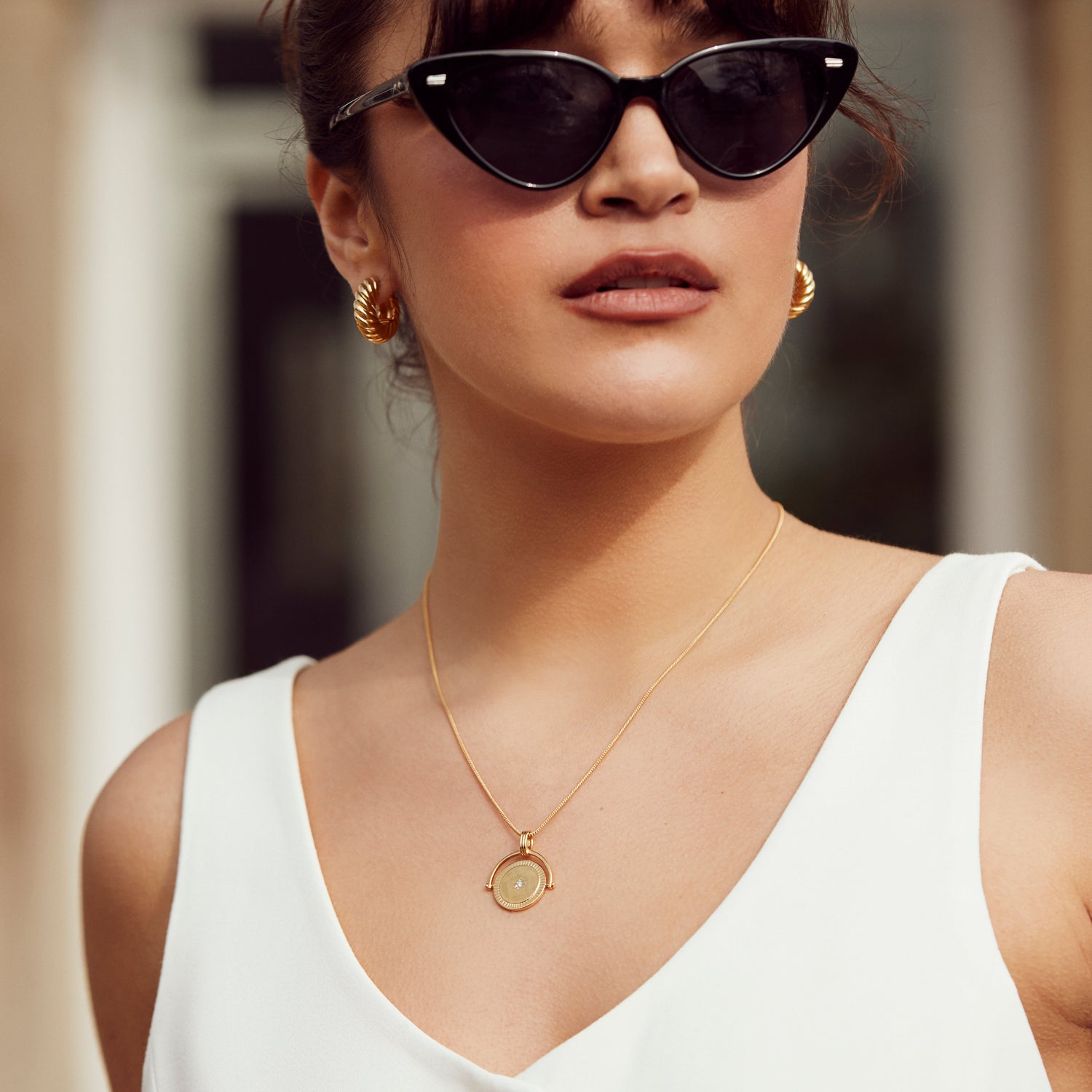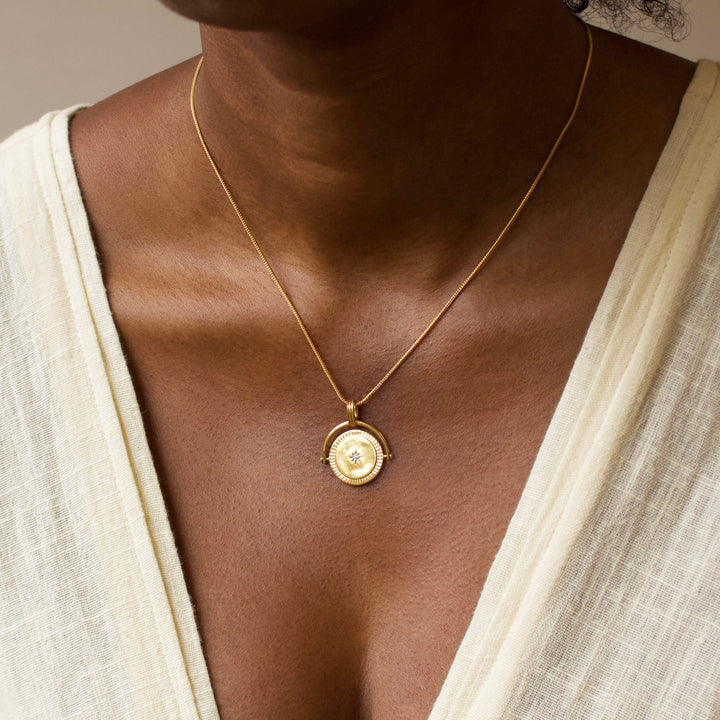 Crafted in gold-plated metal, featuring a star-set moissanite gemstone on one side and an engraved affirmation on the other. Includes a durable chain for comfortable, everyday wear.