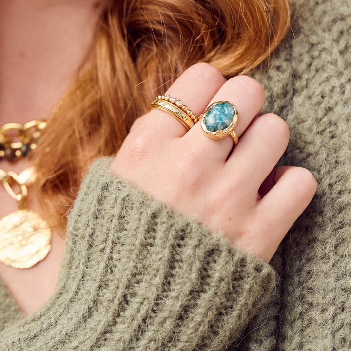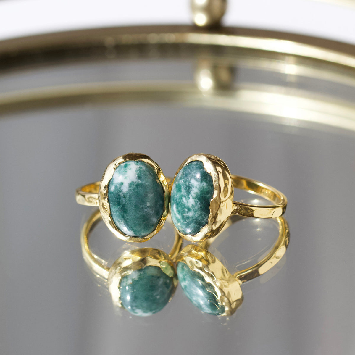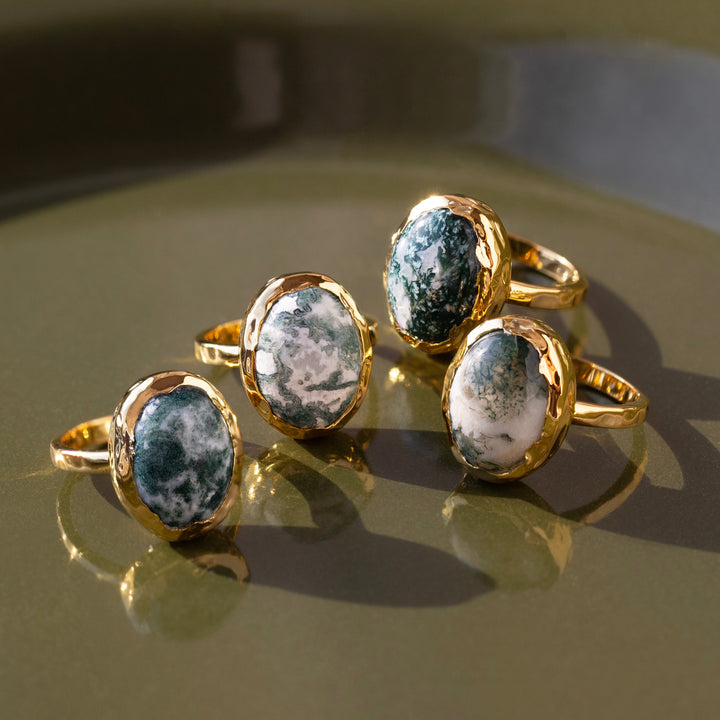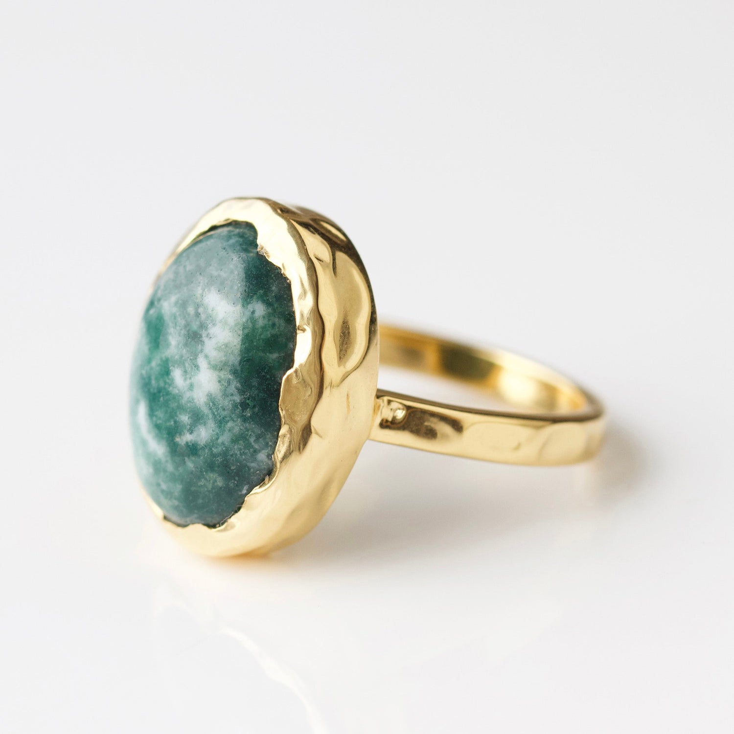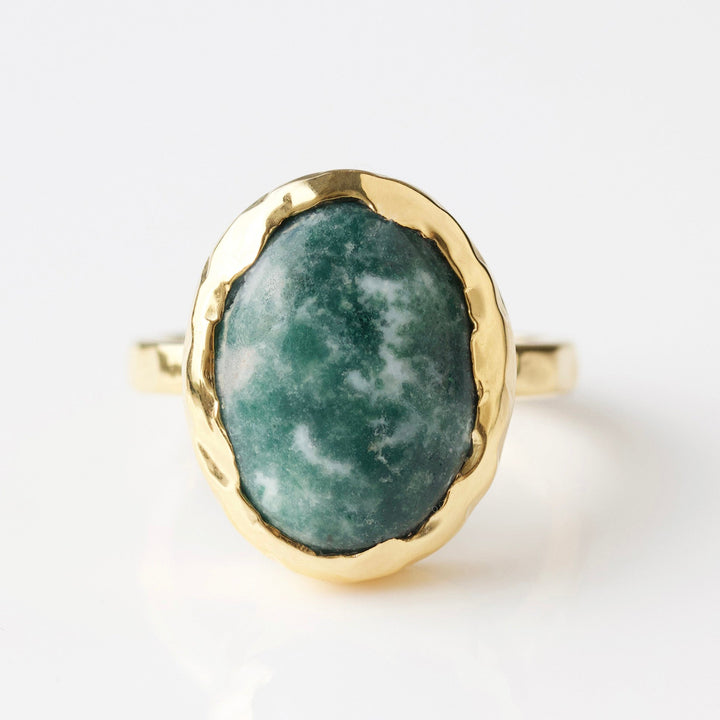 Handcrafted in 14k gold vermeil, featuring a natural snowflake jade gemstone. Each stone is unique, ensuring no two rings are alike. Finished with a high-polish shine for durability and elegance.
