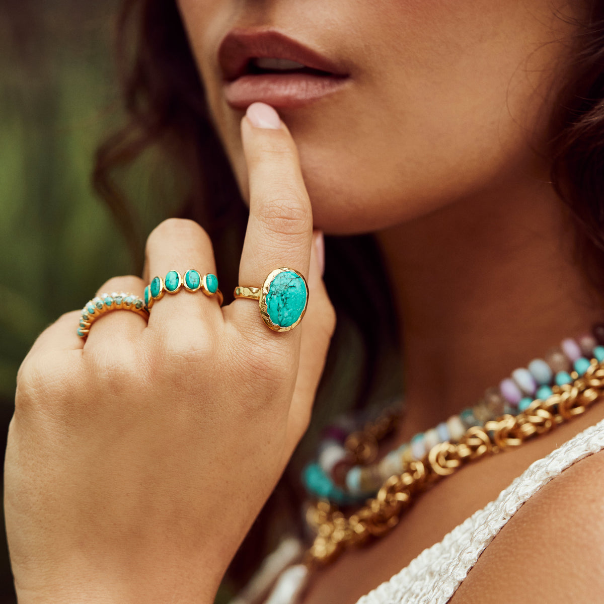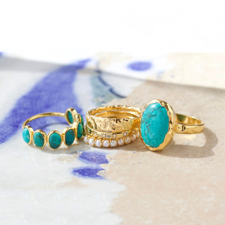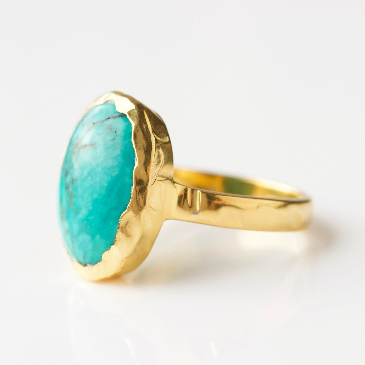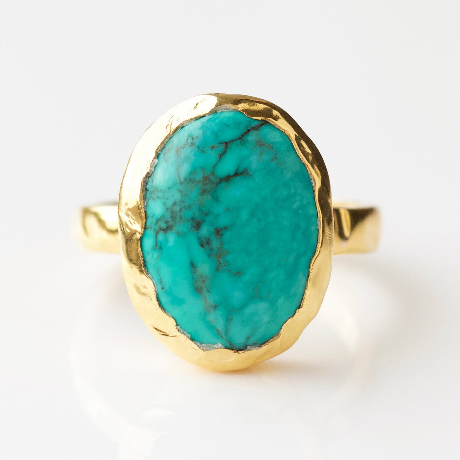 Handcrafted in 14k gold vermeil, featuring a natural turquoise gemstone. Each stone is distinct in shape and pattern, ensuring a one-of-a-kind ring. Finished with a polished surface for a luxurious feel.