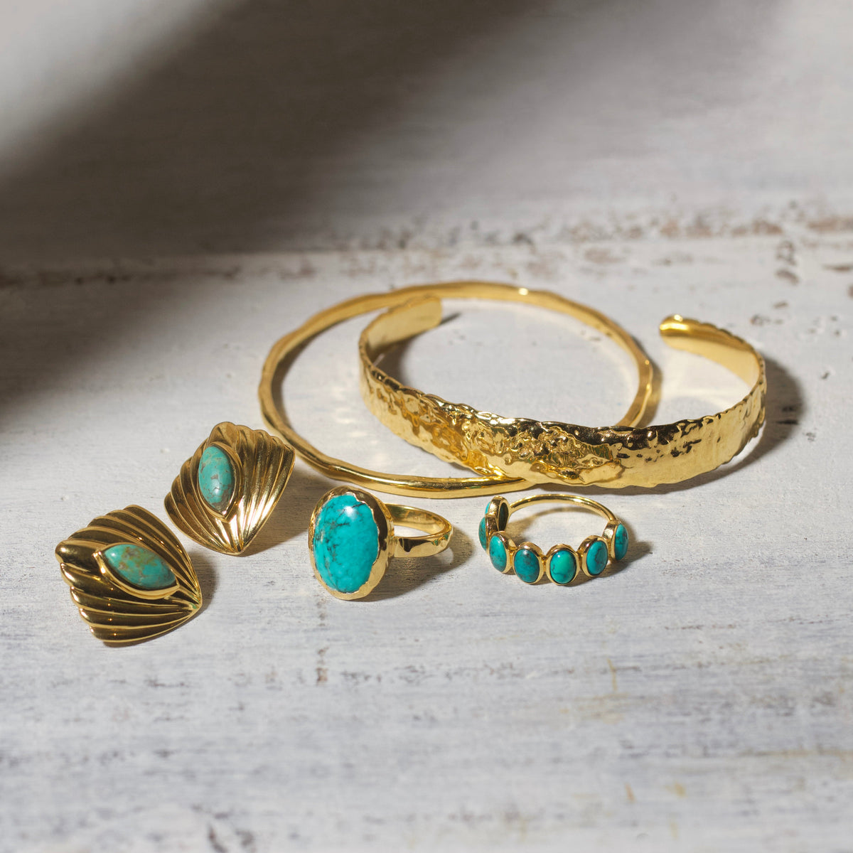 This Molten Organic Turquoise Statement Ring by Carrie Elizabeth in 14k Gold Vermeil combines bold design with timeless elegance. Featuring a unique turquoise gemstone, this ring’s organic form and vibrant stone make it a standout addition to any jewelry collection. Turquoise is known for its protective and balancing properties, bringing both beauty and meaning to this exceptional piece.