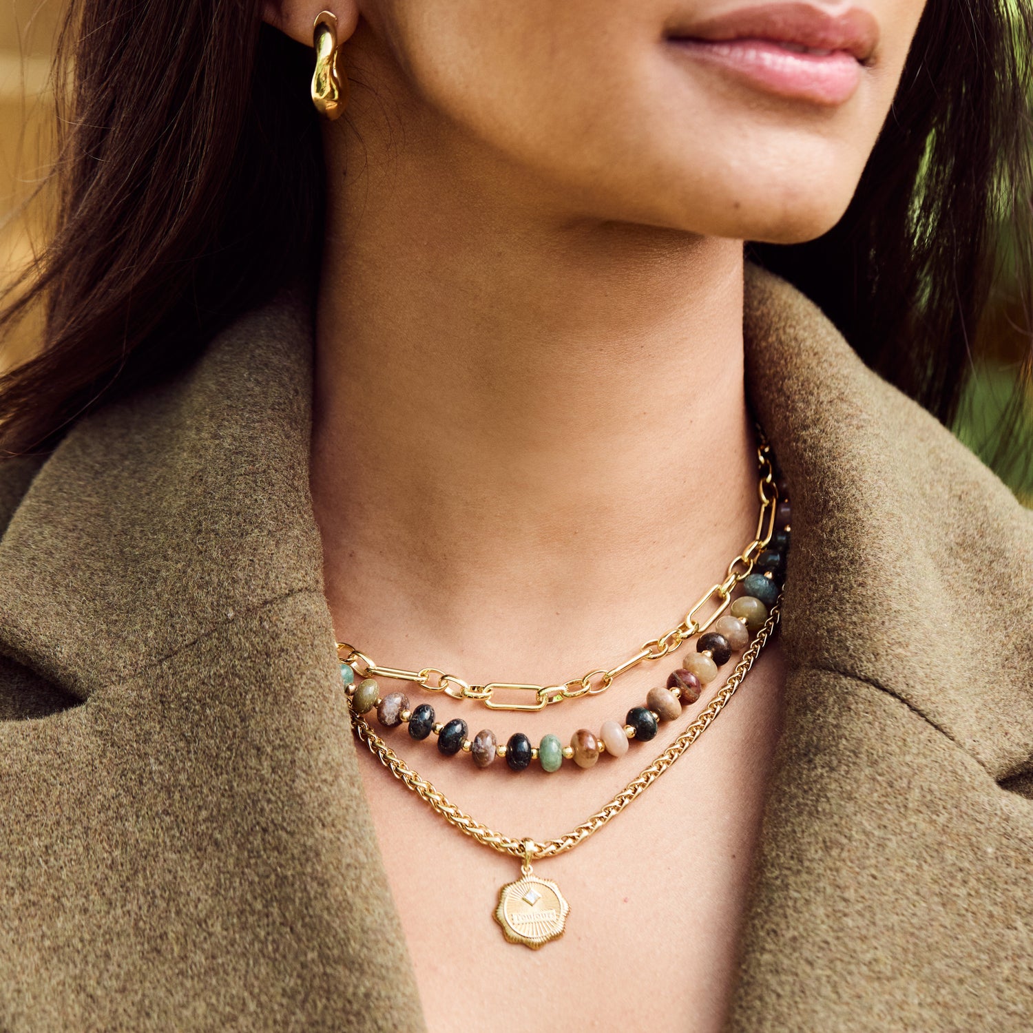 Crafted with gold-plated hardware and natural moss agate beads. Polished for a radiant finish, showcasing the earthy tones of the gemstone.