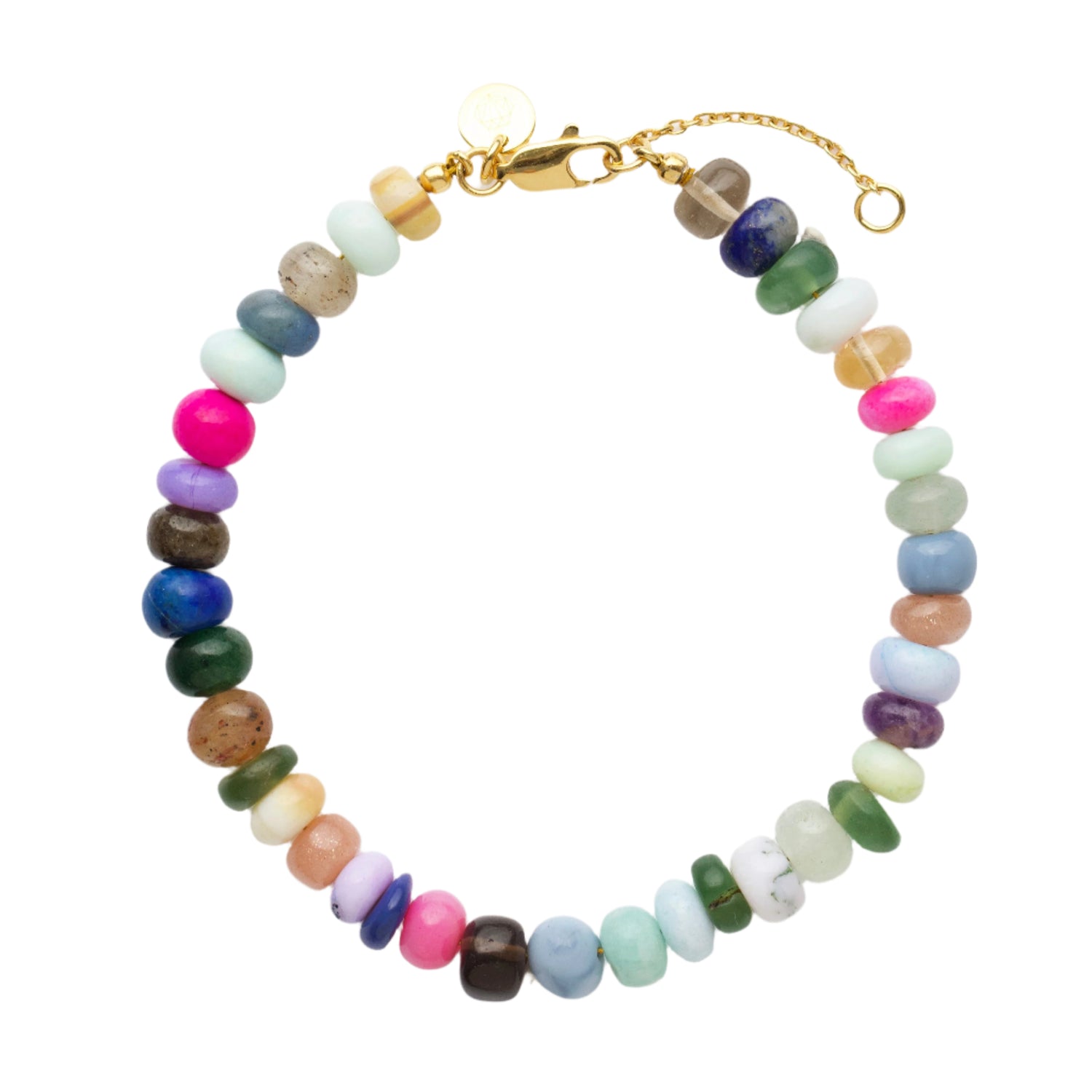 Crafted with 14k gold-plated hardware and natural multi-colored agate beads. Each bracelet is unique, with variations in bead color and pattern. Polished for a high-quality, radiant finish.
