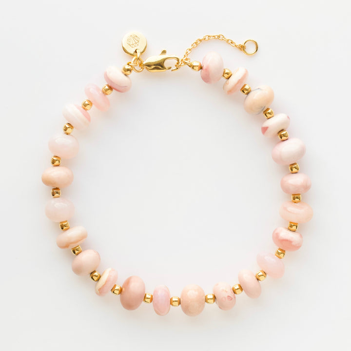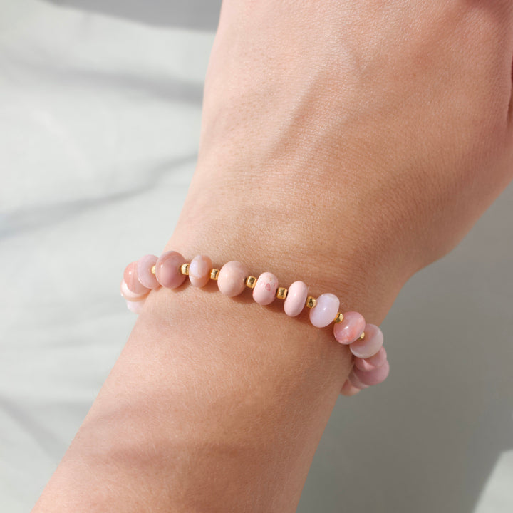 Crafted with gold-plated metal and natural pink opal beads. Features a secure clasp for comfortable wear.
