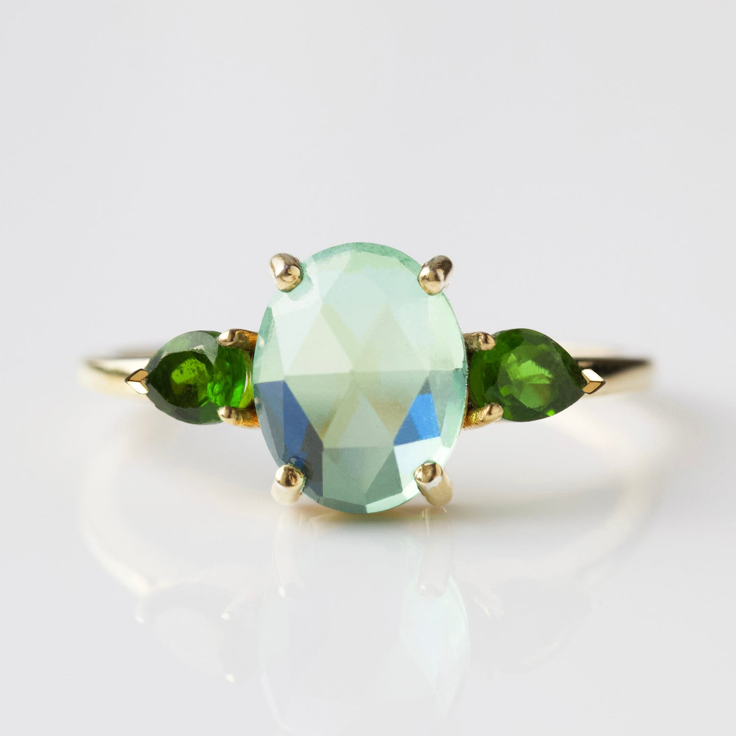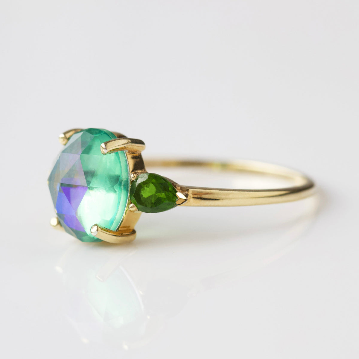 Crafted in 14k gold vermeil with a quartz centerpiece and Diopside side stones. Designed for durability and everyday wear.