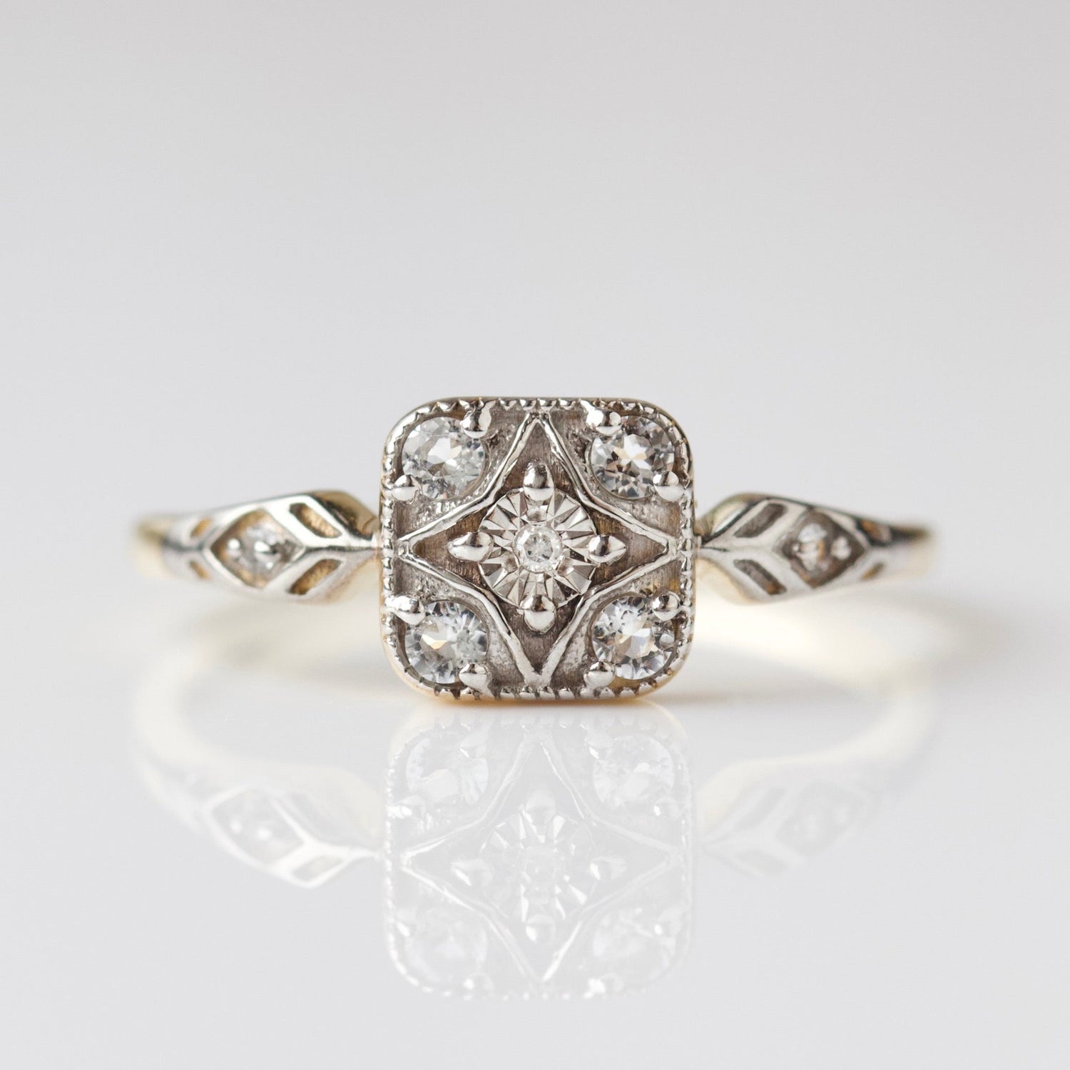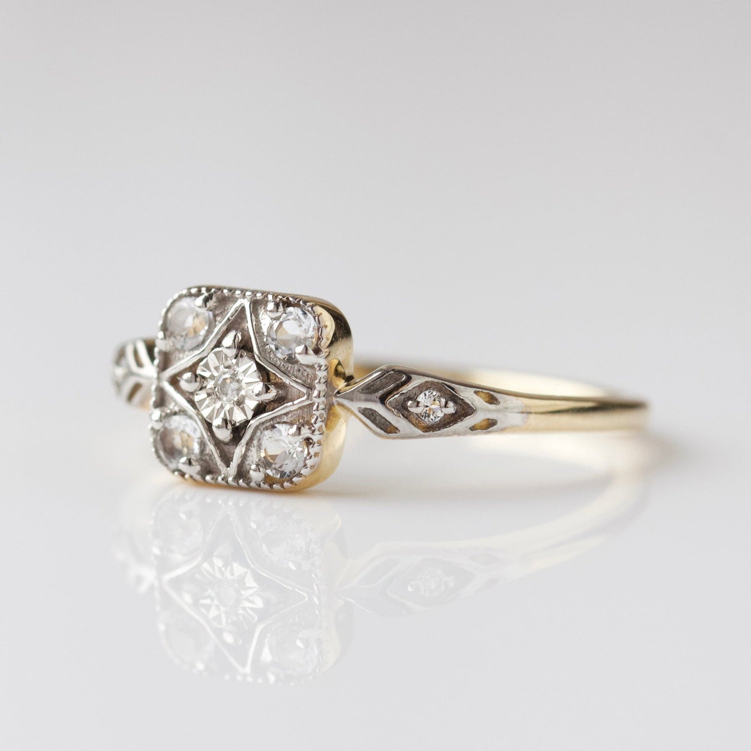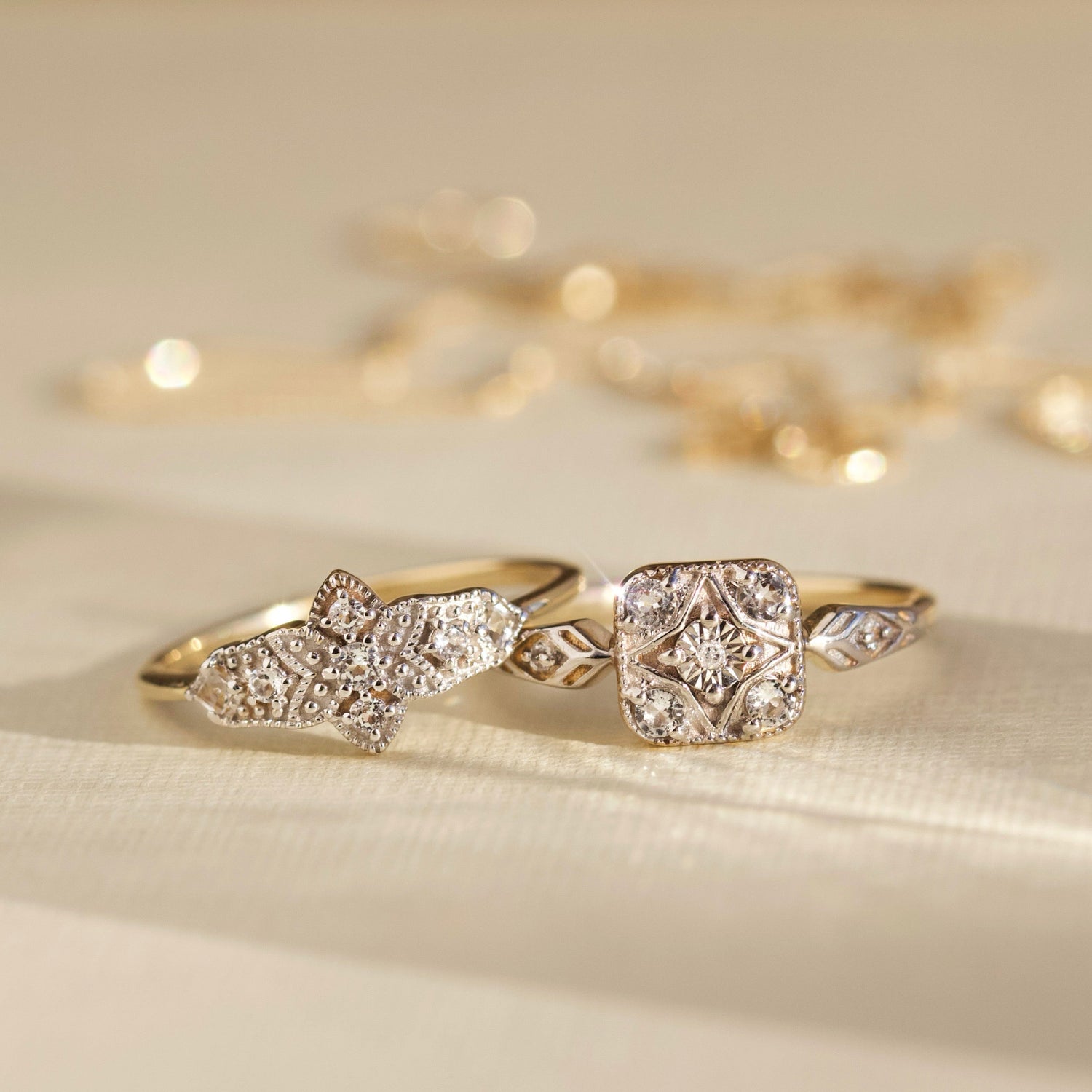 This Rosie Diamond Vintage Compass Ring by Carrie Elizabeth brings old-school glamour to your jewelry box. Crafted in 9k solid yellow gold, it features a celestial-inspired compass design with a sparkling diamond center surrounded by white topaz stones. A perfect blend of vintage charm and modern sophistication, this ring is a timeless piece to treasure.