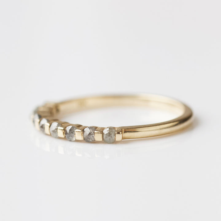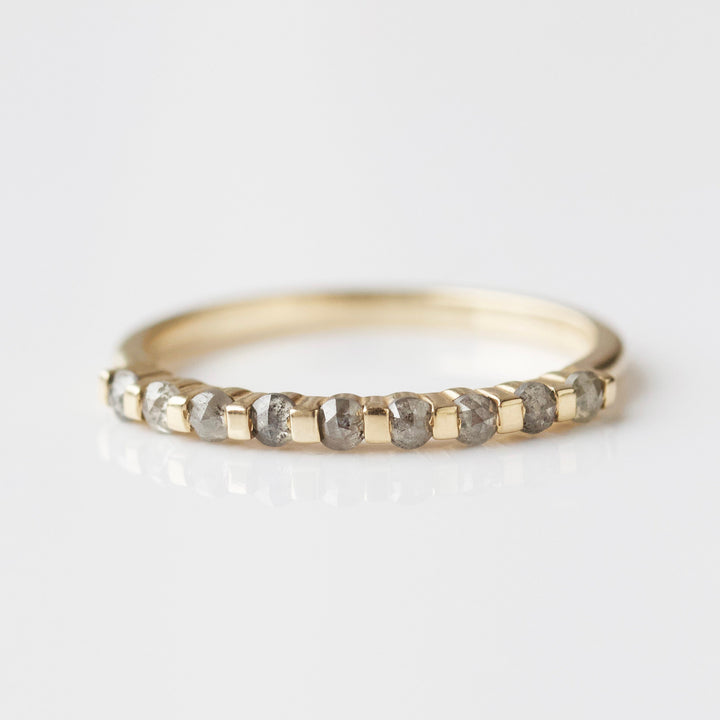 Handcrafted in 9k solid yellow gold with salt and pepper diamonds. Designed with a half eternity band style for a vintage-inspired aesthetic.