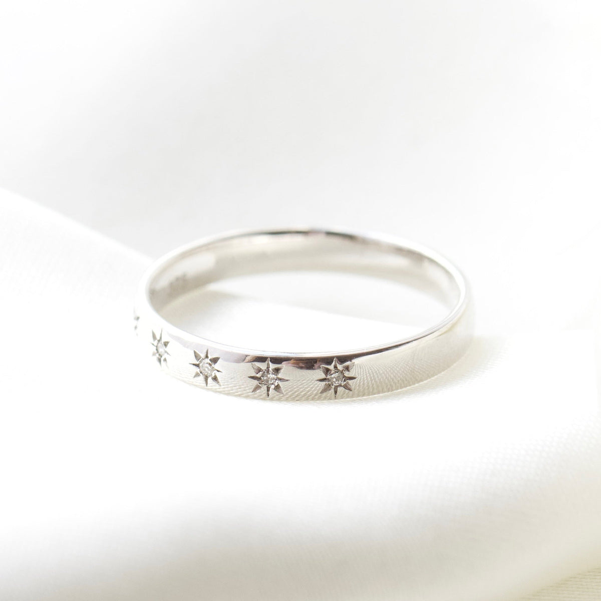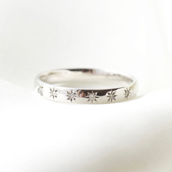 Handcrafted in 14k solid white gold, featuring ethically sourced diamonds in a starry motif. Comes packaged in a grey keepsake velvet ring box and includes a hand-foiled 'Written in the Stars' card. Lead time: 6-8 weeks for made-to-order items. Complimentary resizing available for one UK size up or down (restrictions apply for engraved pieces).