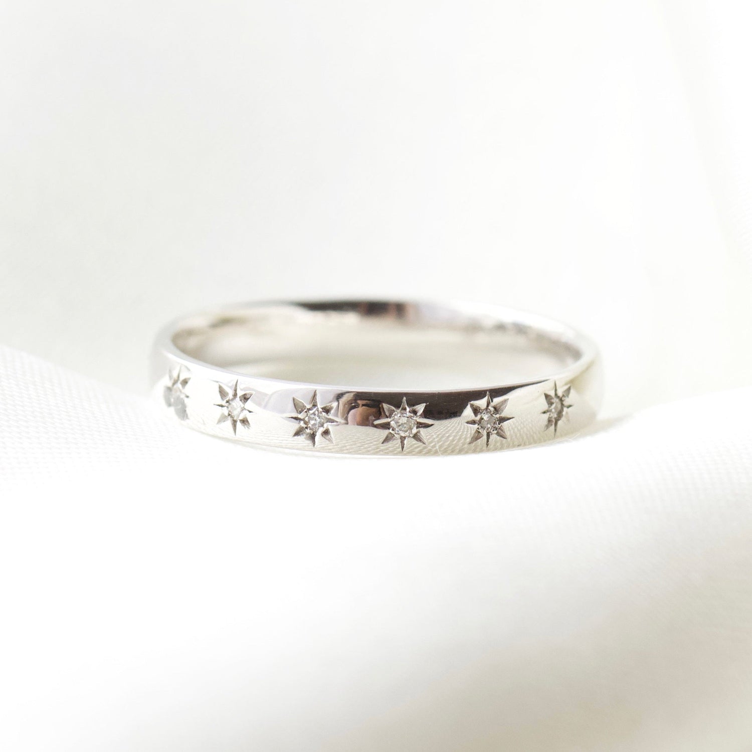 This Simple Star Set Diamond Band by Carrie Elizabeth is a timeless expression of elegance and love. Part of the Written in the Stars collection, it showcases a vintage-inspired design with twinkling diamond stars, embodying cosmic charm and sophistication. Designed in London by founder Carrie Dennahy and crafted by skilled artisans in Jaipur, this band is perfect as a wedding or engagement ring, or as an heirloom piece to treasure forever. Ideal for stacking or wearing solo, it’s a versatile and meaningful addition to any jewelry collection.