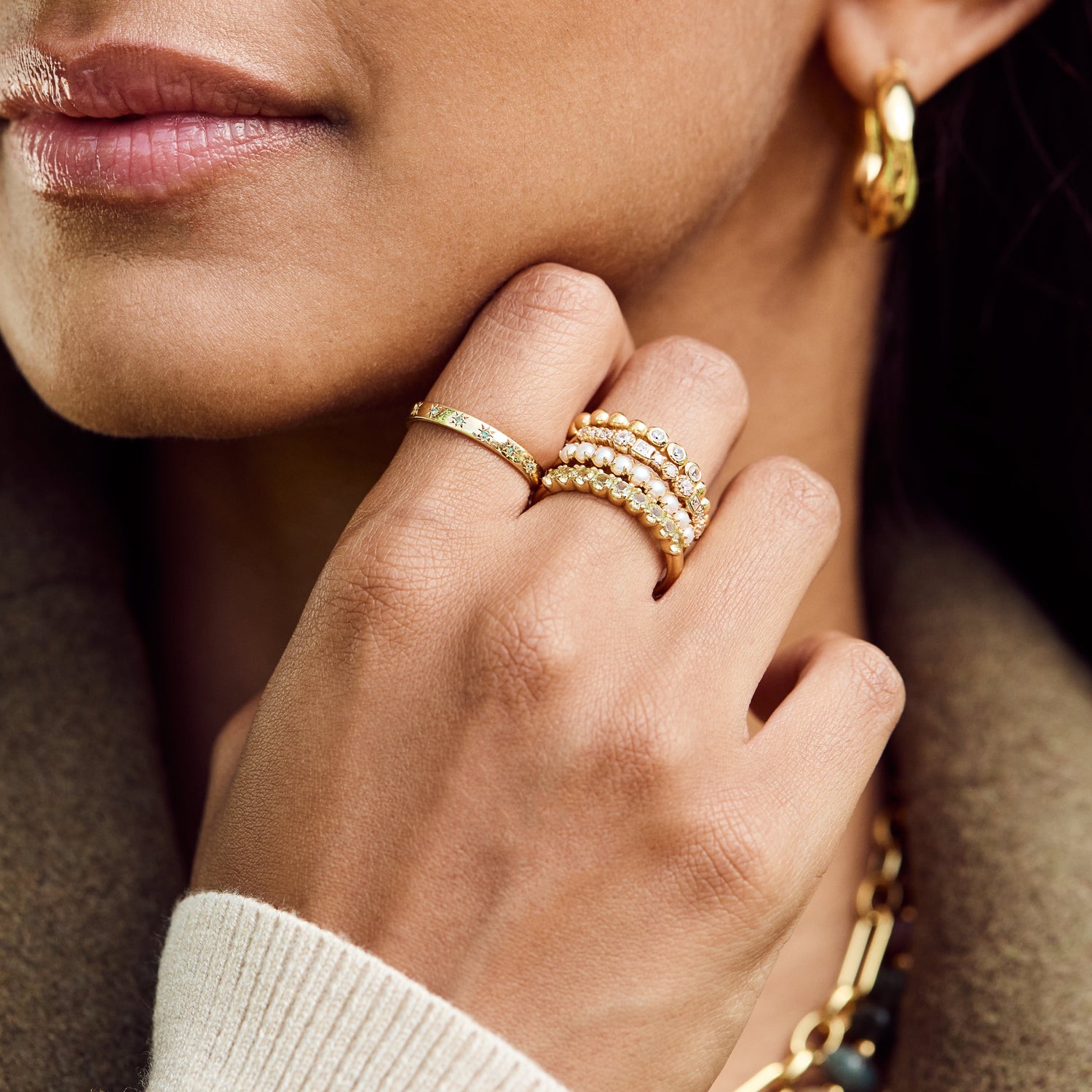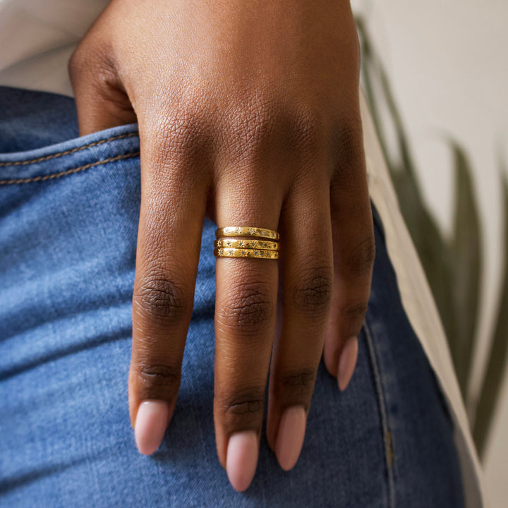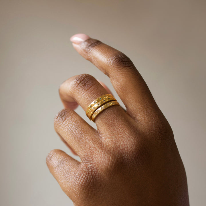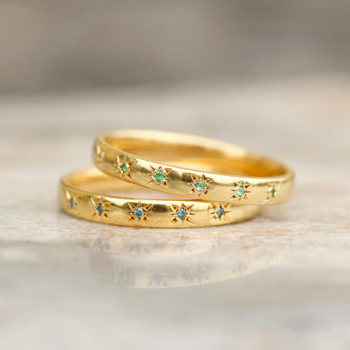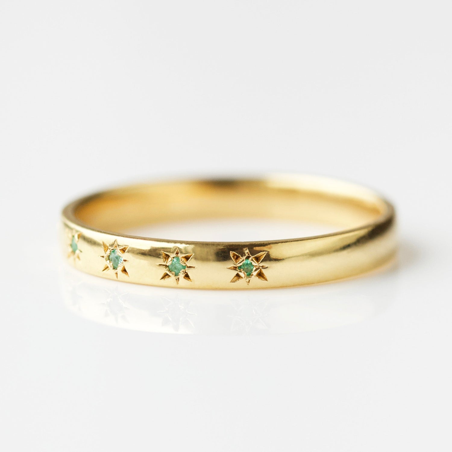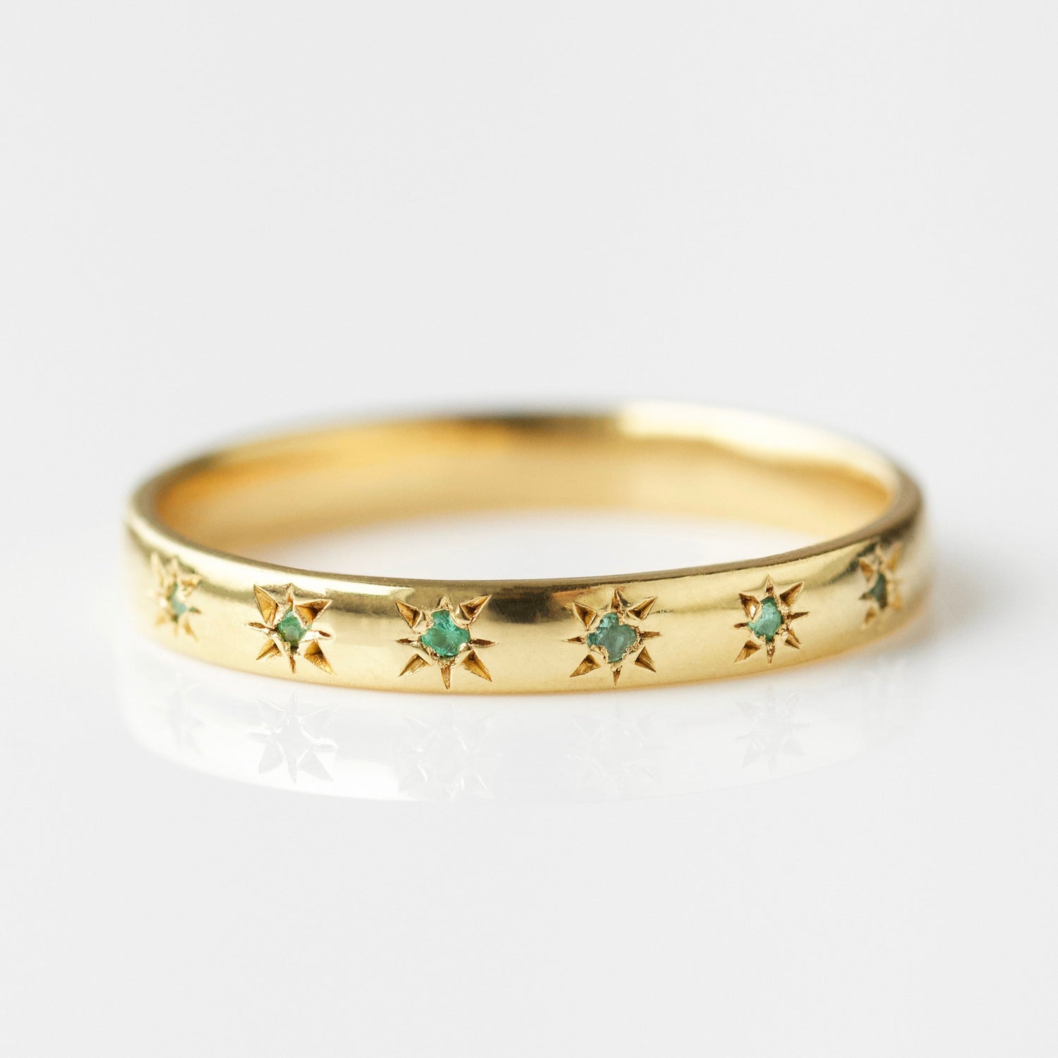 This Simple Star Set Emerald Band by Carrie Elizabeth is a radiant take on the brand's bestselling design, now featuring sparkling emeralds. The vibrant green gemstones are star-set into a gold band, adding a celestial touch to its timeless elegance. Perfect for stacking or wearing alone, this piece embodies unity, compassion, and unconditional love, making it a meaningful addition to any jewelry collection. Whether as a gift or a personal treasure, its versatility ensures it complements any style effortlessly.