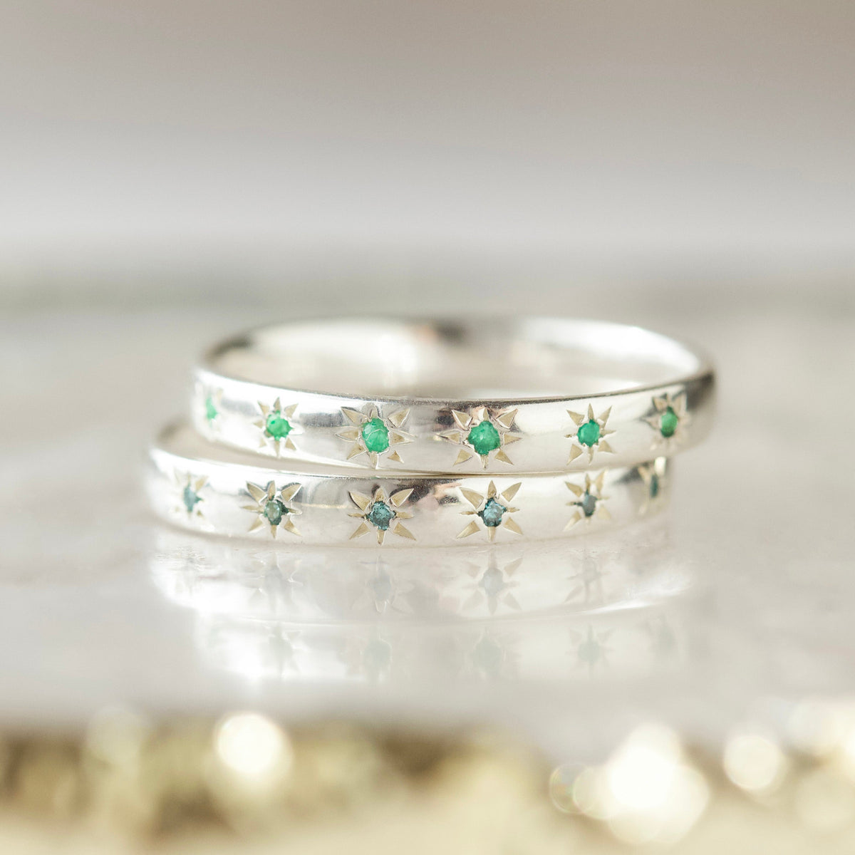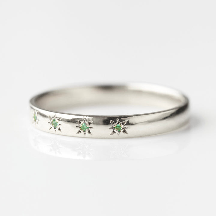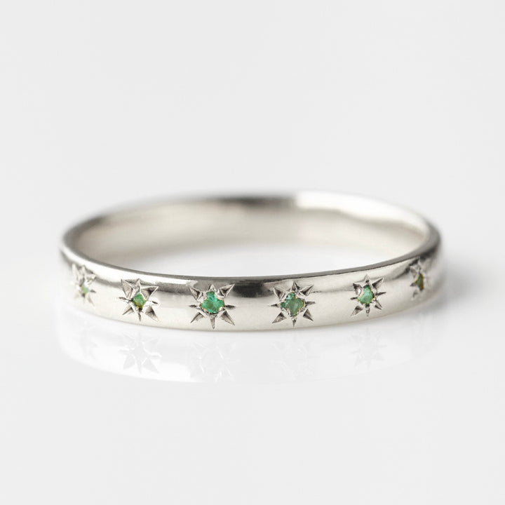 Crafted in sterling silver with ethically sourced emeralds star-set into the band. Designed with exceptional attention to detail, ensuring lasting quality. Delivered in beautiful packaging, making it ideal for gifting or personal keepsakes.