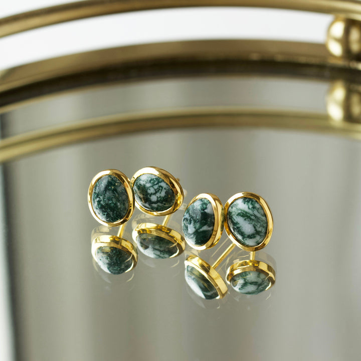 Crafted in 14k gold vermeil with snowflake jade gemstones. Each piece is uniquely shaped and patterned, emphasizing individuality. Delivered in stylish packaging, ideal for gifting or personal treasures.