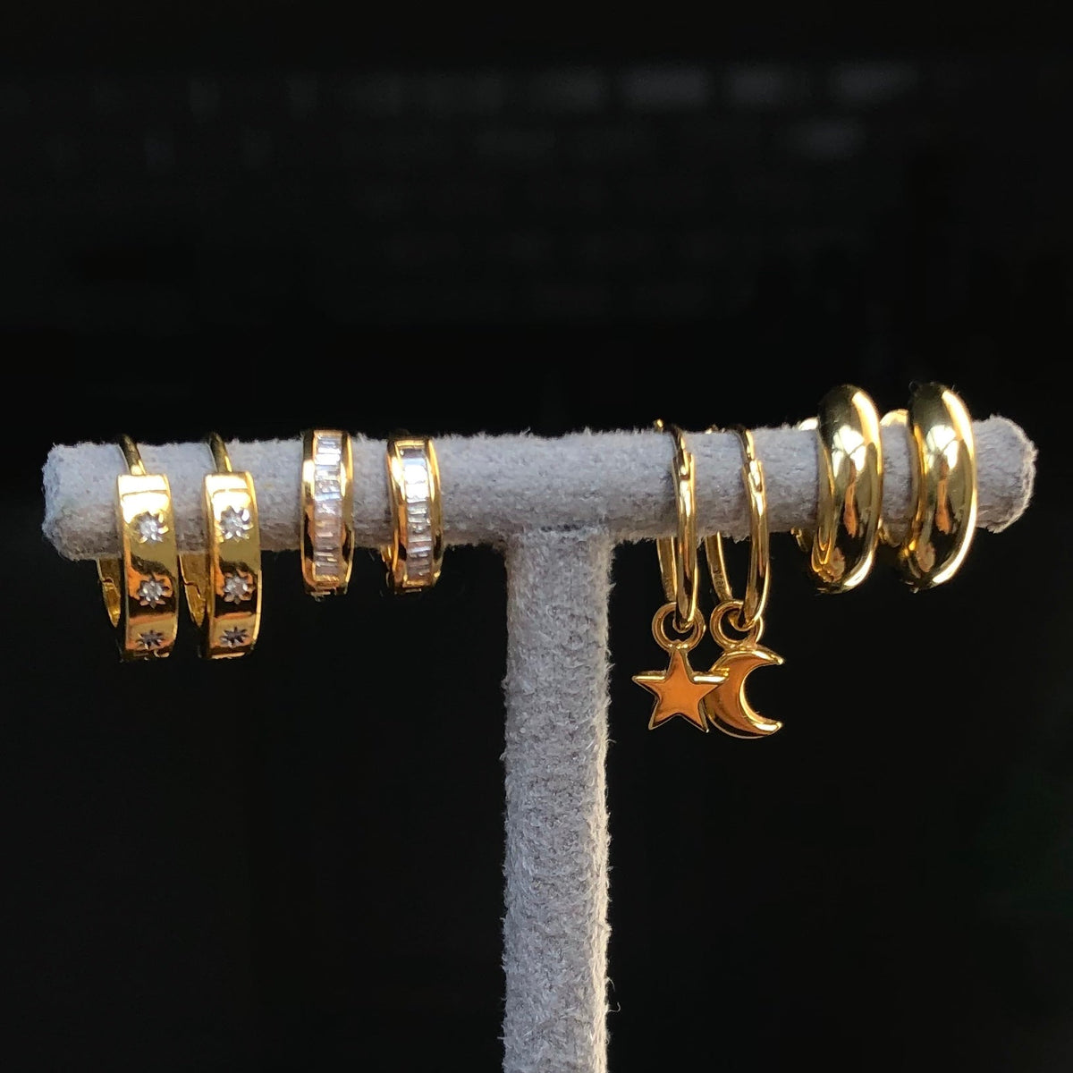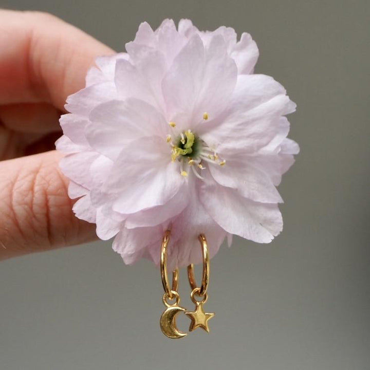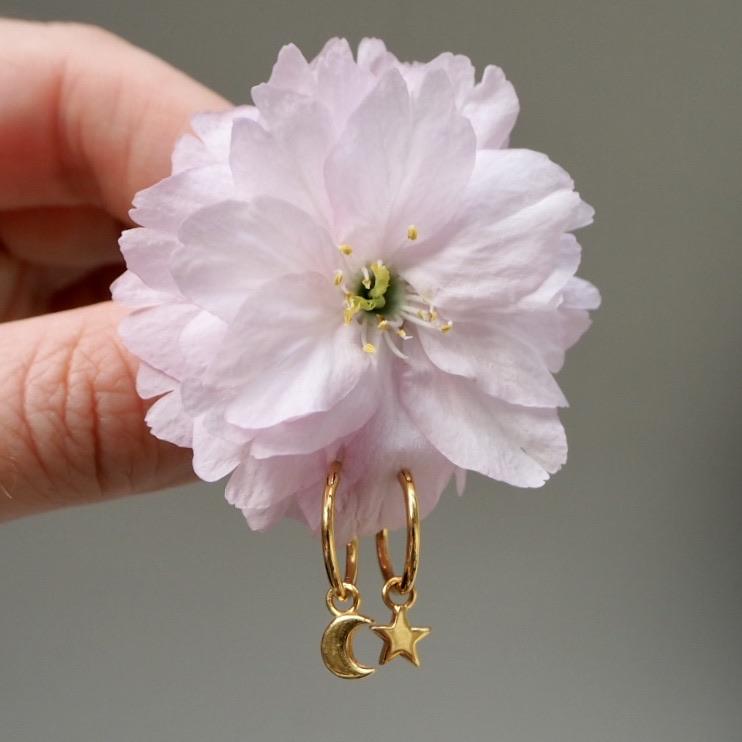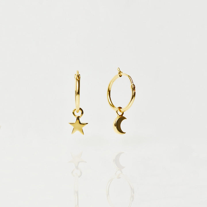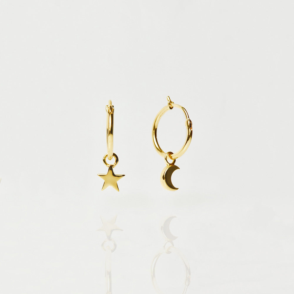 Crafted in 14k gold vermeil. Hoop earrings with star and moon charms that dangle elegantly. Designed for comfort and everyday wear. Delivered in stylish packaging, perfect for gifting.