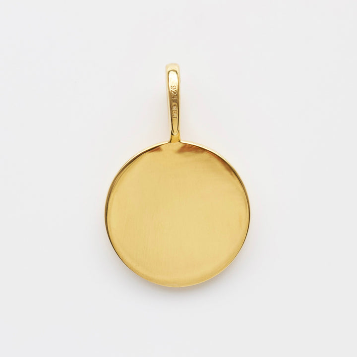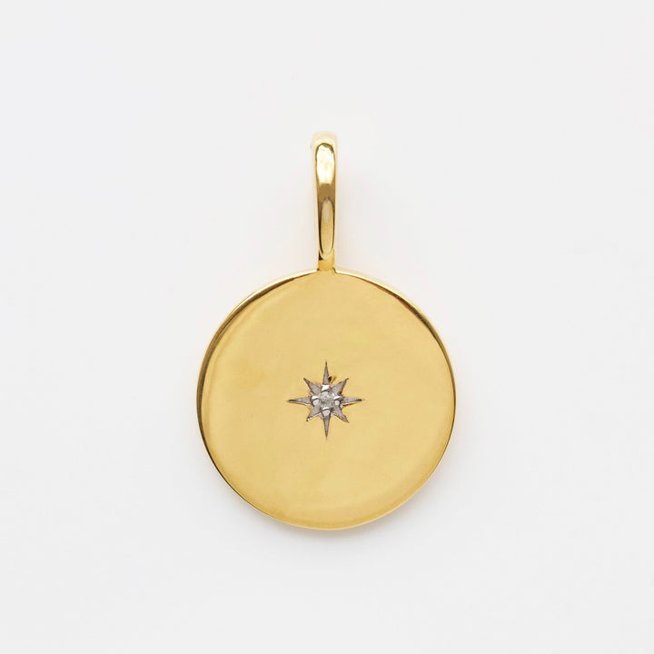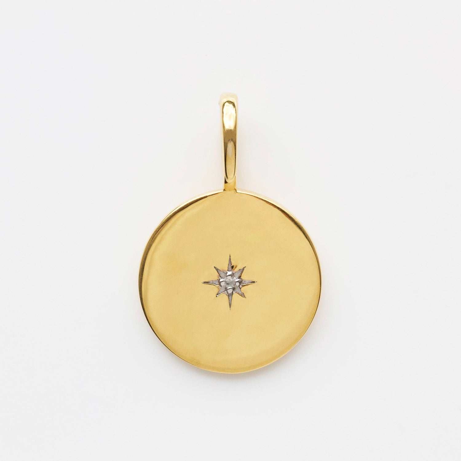 This Star Set Diamond Engravable Pendant by Carrie Elizabeth is a timeless piece to keep close to your heart. Featuring a diamond star-set design, this pendant symbolizes purity and holds cleansing powers for the body and mind. Personalize it with a name, word, or date (up to 10 letters) for a truly unique keepsake. Perfectly pairs with a luxe link chain for a chic, modern look.