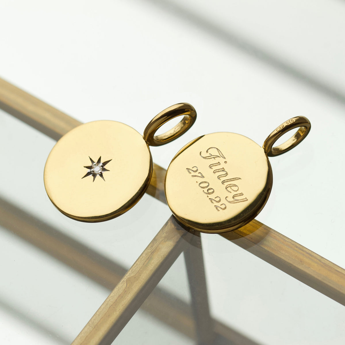 Crafted in 14k gold vermeil or sterling silver, with a diamond star-set detail. Engravable with up to 10 letters (two rows) or 3 large initials. Engraved items are dispatched within 3-5 working days and are non-returnable. Delivered in stylish packaging, ideal for gifting.