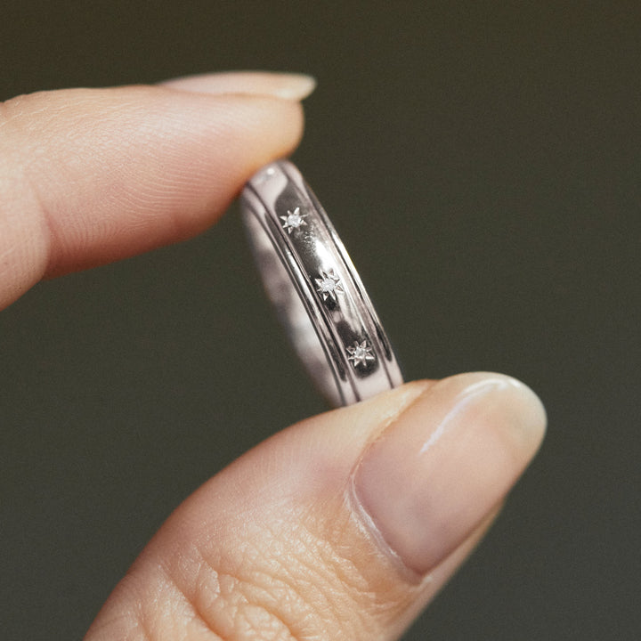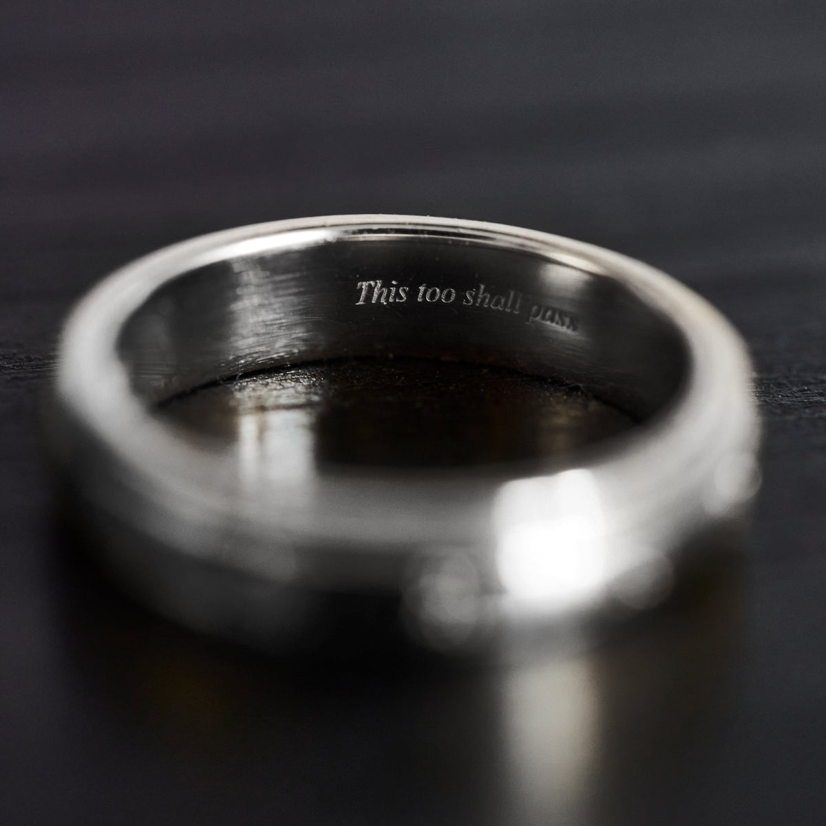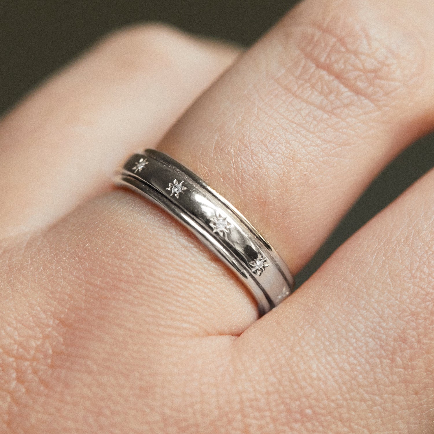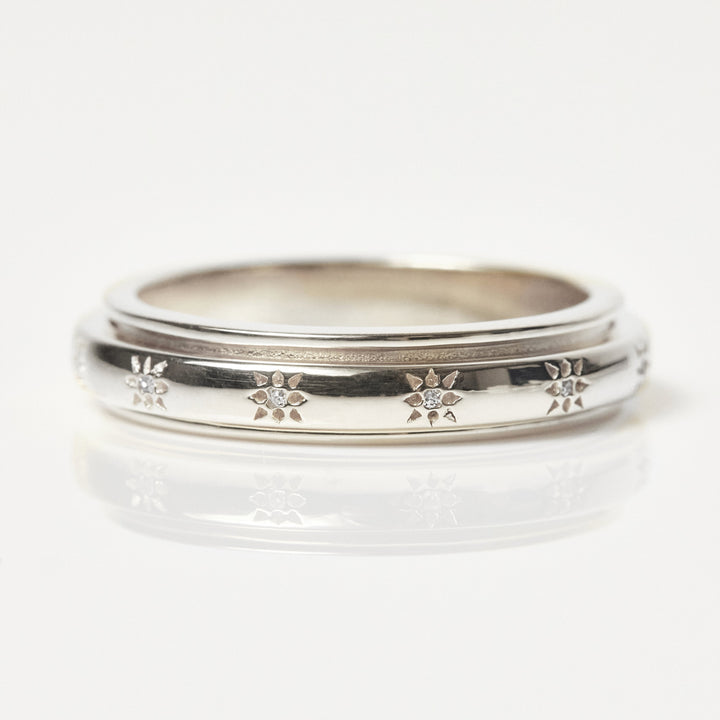Crafted in sterling silver, featuring six single-cut diamonds in a star-shaped setting. Incorporates a spinning mechanism for tactile comfort. Engraved with "This too shall pass" on the inner band. Delivered in elegant packaging, ideal for gifting or personal keepsakes.