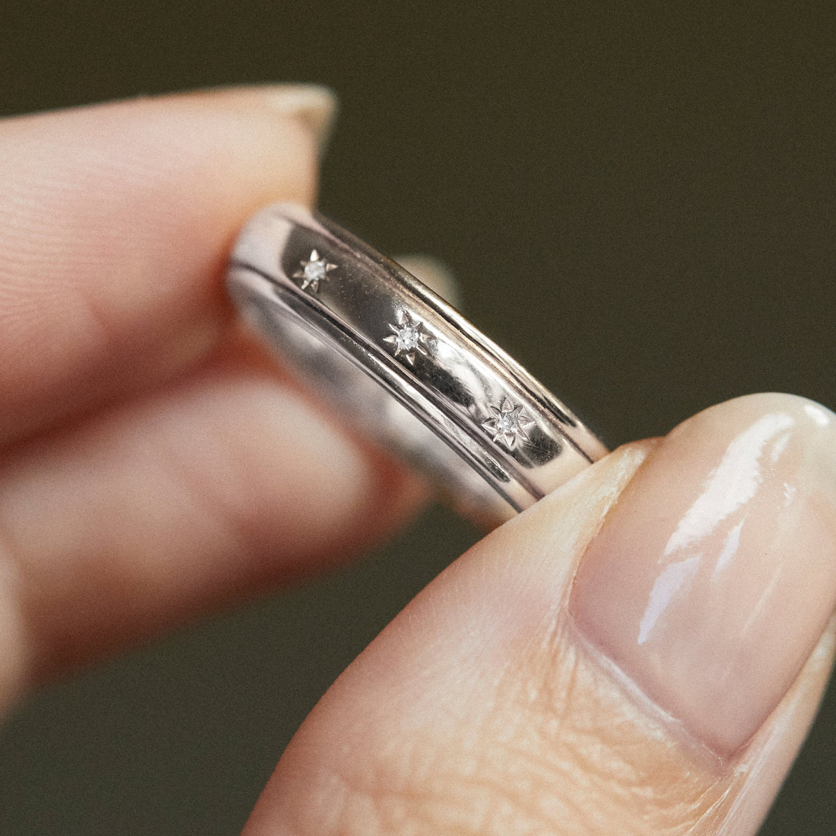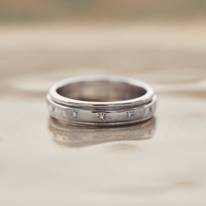 This Star Set Diamond Spinning Ring by Carrie Elizabeth combines elegant design with a purposeful function. Crafted with a smooth spinning element, this ring is designed to help alleviate stress and anxiety, offering a calming source of comfort and reassurance. Adorned with six single-cut diamonds in a star-shaped setting, it exudes timeless elegance. Engraved on the inside with the reassuring phrase, "This too shall pass," this piece is as meaningful as it is beautiful. Perfect for stacking or wearing solo, it’s a thoughtful gift or a personal reminder of resilience.