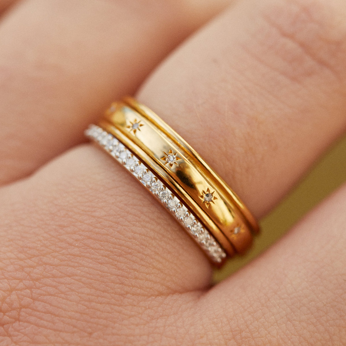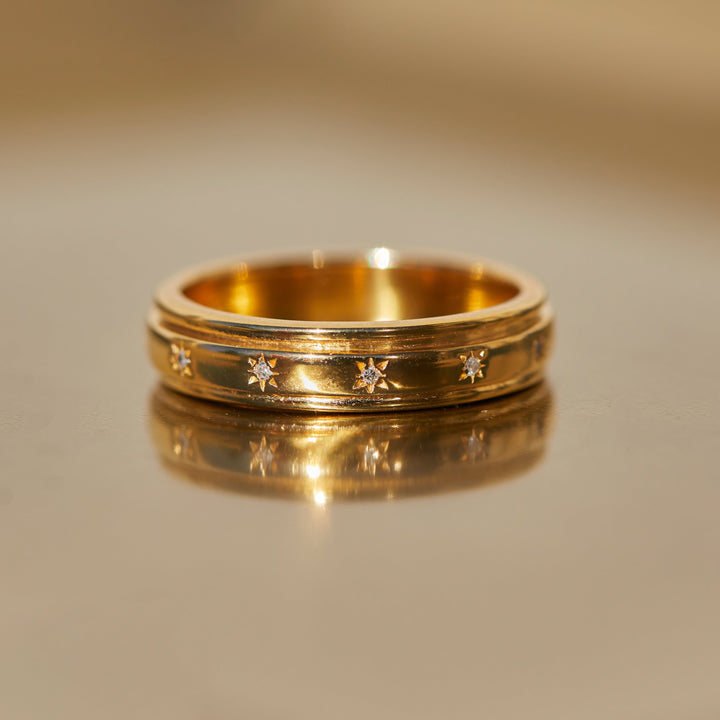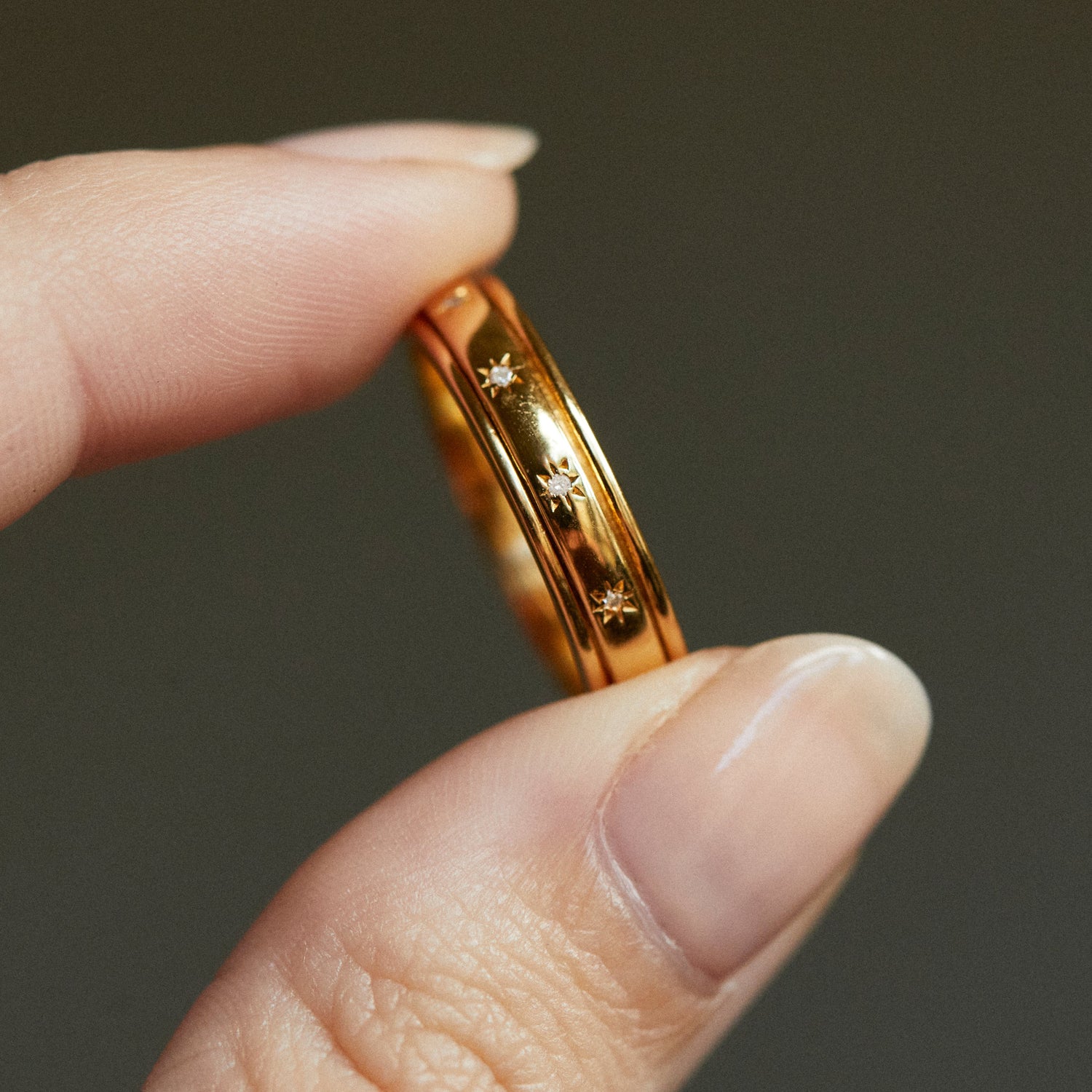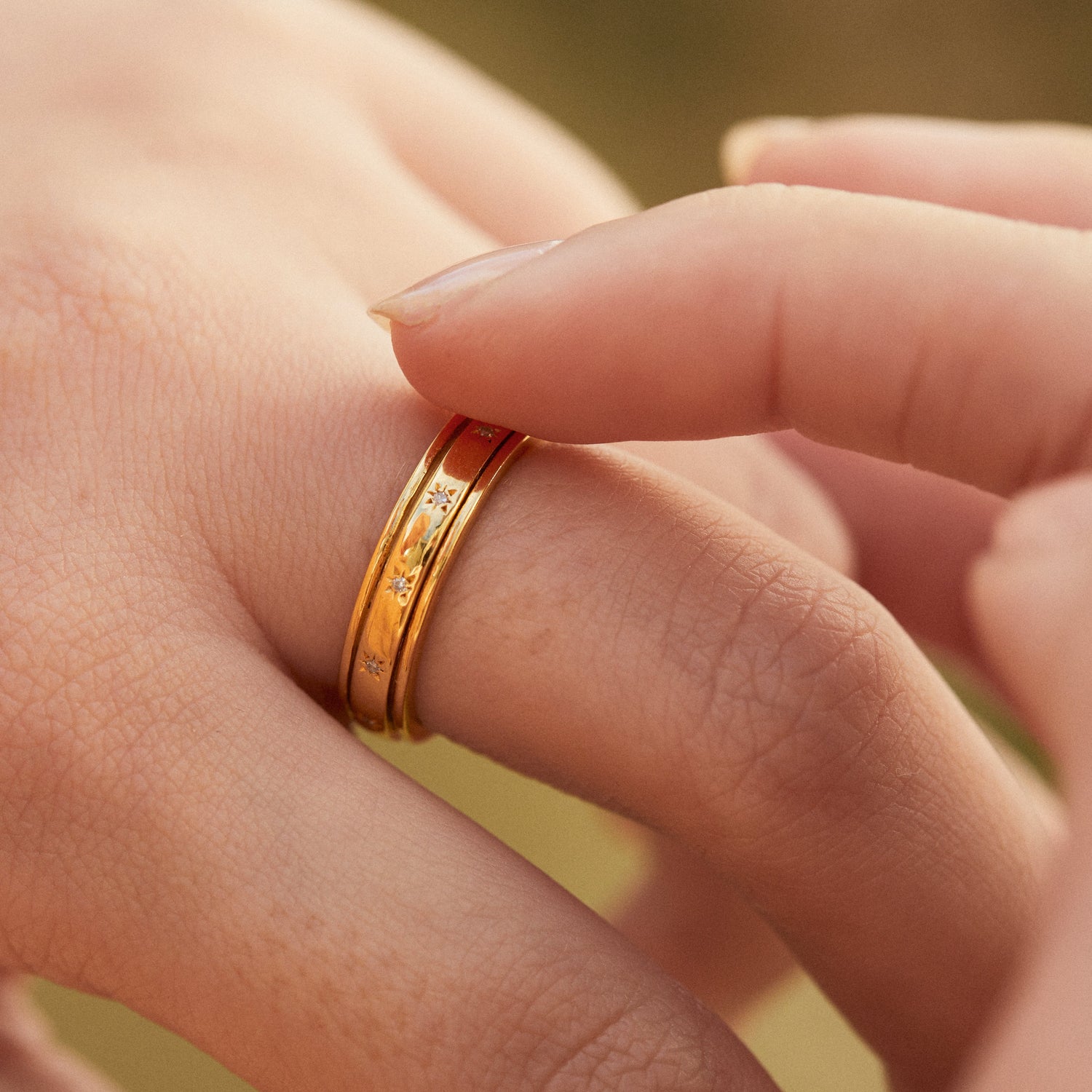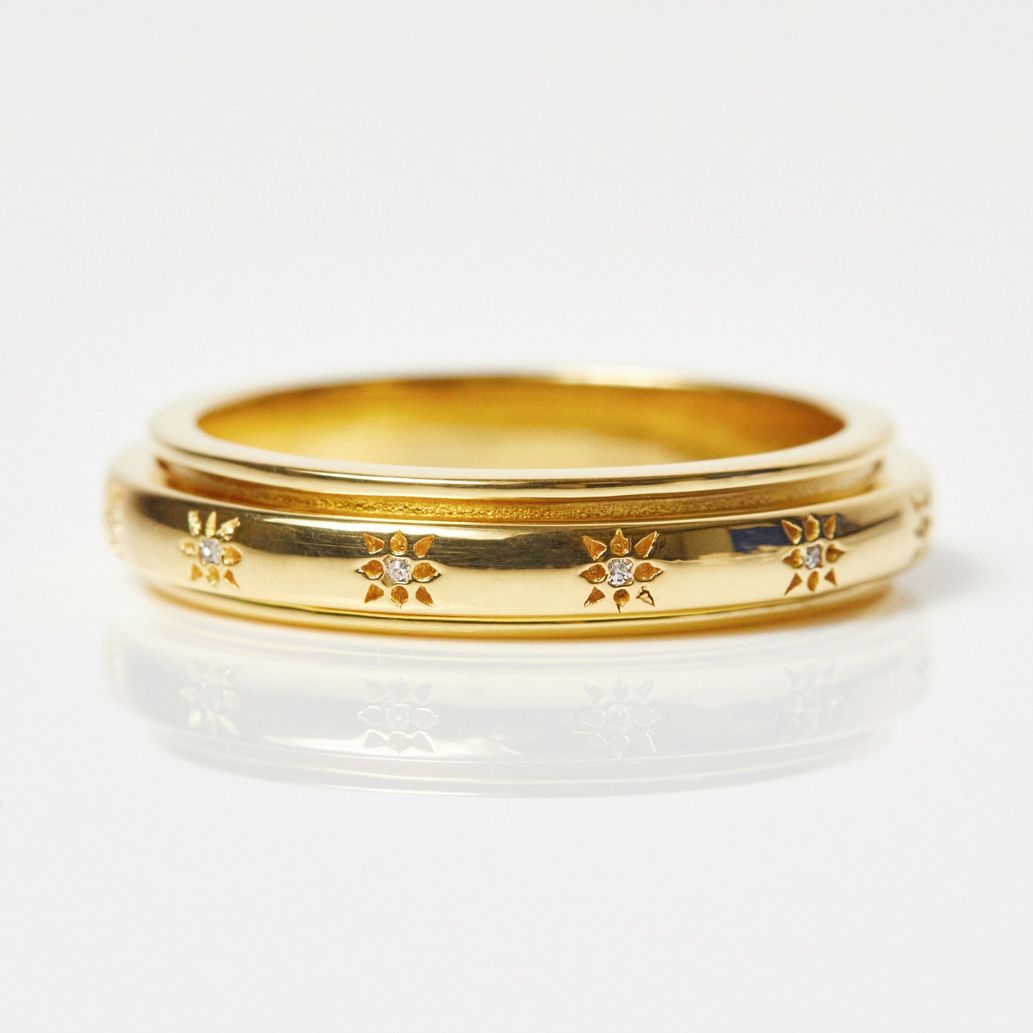 Crafted in 14k gold vermeil, featuring six single-cut diamonds in a star-shaped setting. Incorporates a spinning mechanism for tactile comfort. Engraved with "This too shall pass" on the inner band. Delivered in luxurious packaging, ideal for gifting or personal wear.