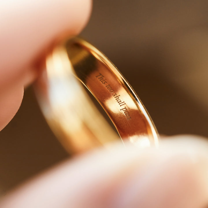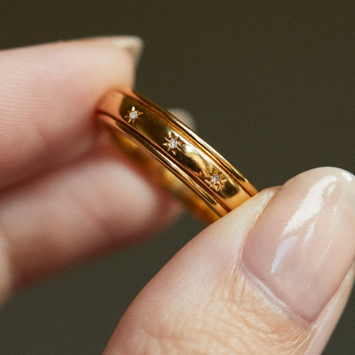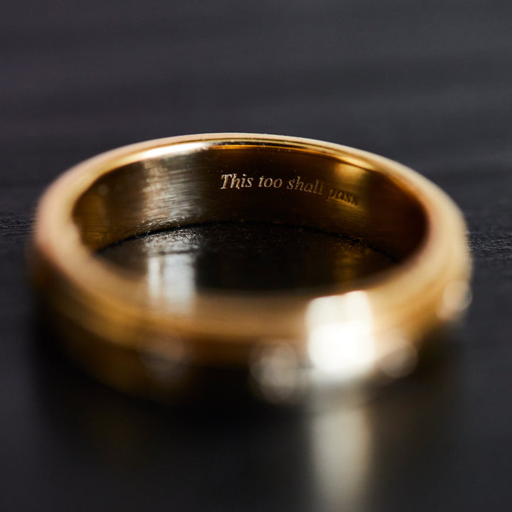 This Star Set Spinning Ring by Carrie Elizabeth is a meaningful blend of elegance and function. Designed to alleviate stress and anxiety, its smooth spinning element offers a calming distraction. Adorned with six single-cut diamonds in a star-shaped setting, this timeless piece radiates celestial charm. Engraved with the reassuring phrase, "This too shall pass," it serves as a gentle reminder of resilience. Perfect for stacking or wearing solo, this ring combines style with purpose.