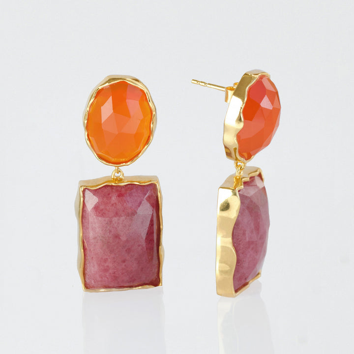 These Statement Double Gemstone Earrings by Carrie Elizabeth are vibrant and bold, featuring faceted orange agate and rhodonite gemstones. Perfect for standout dressing, these earrings bring a pop of color and elegance to both casual and formal outfits. Agate is known for its balancing properties and its ability to spark bright ideas and attract positive energies, making these earrings as meaningful as they are stunning.